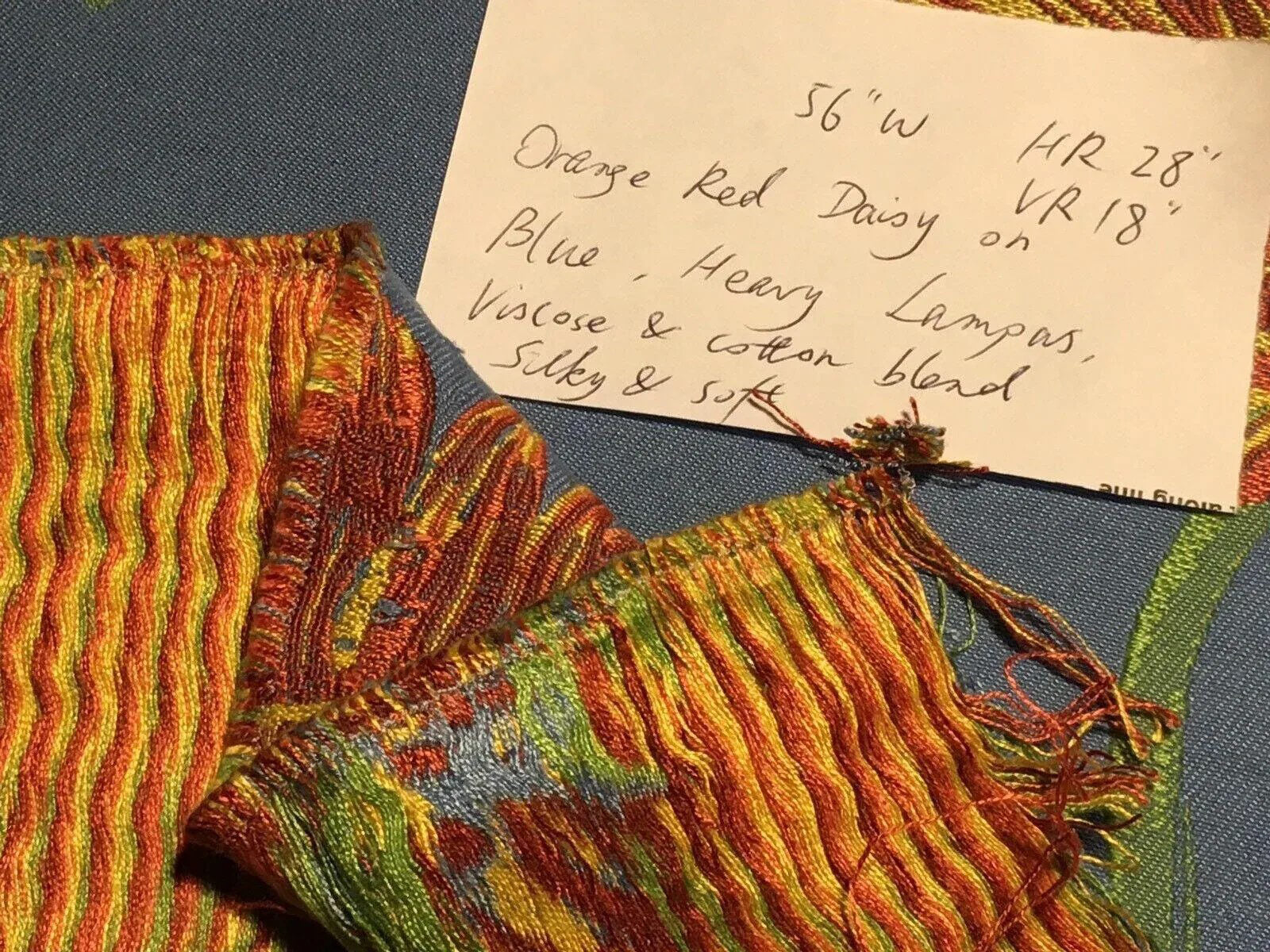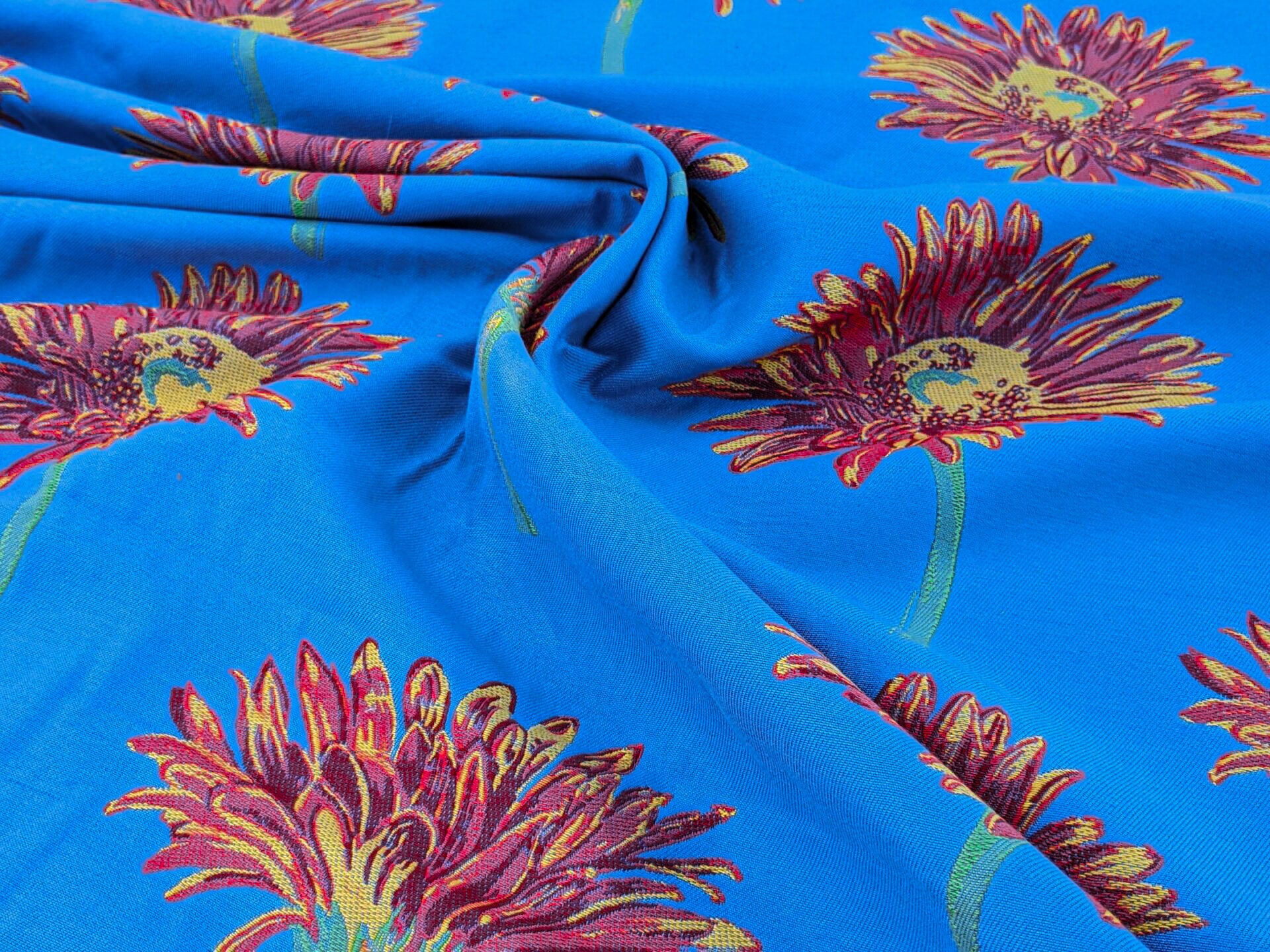 By yard High End Designer Lampas Orange Red Daisy on Blue Heavy! (1561)