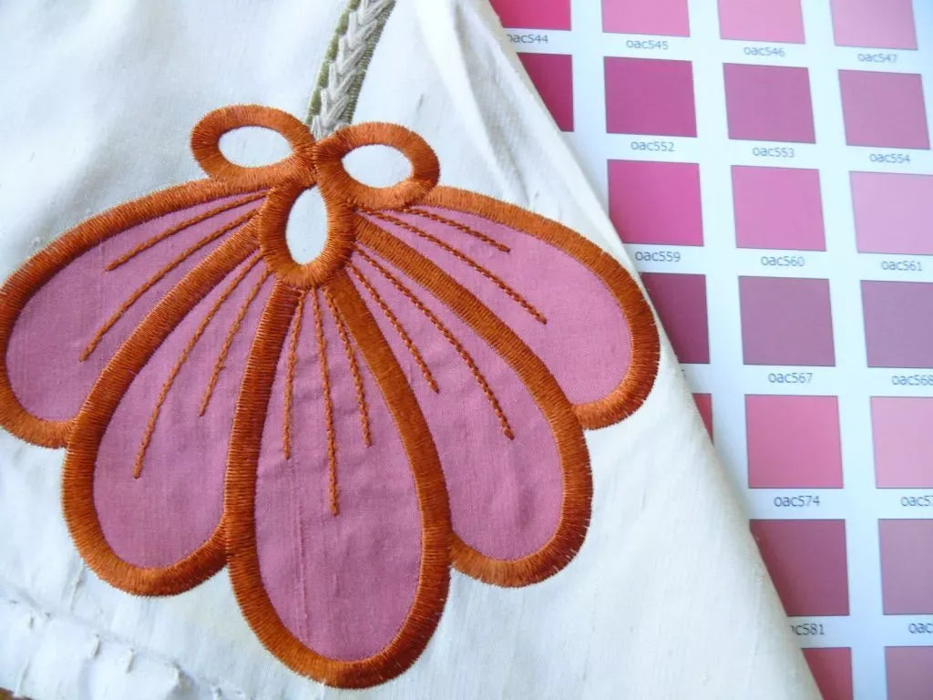 Color: base is cream white (a bright white); embroidery in red, pink, orange, light green, brown, gold and palest sage green.