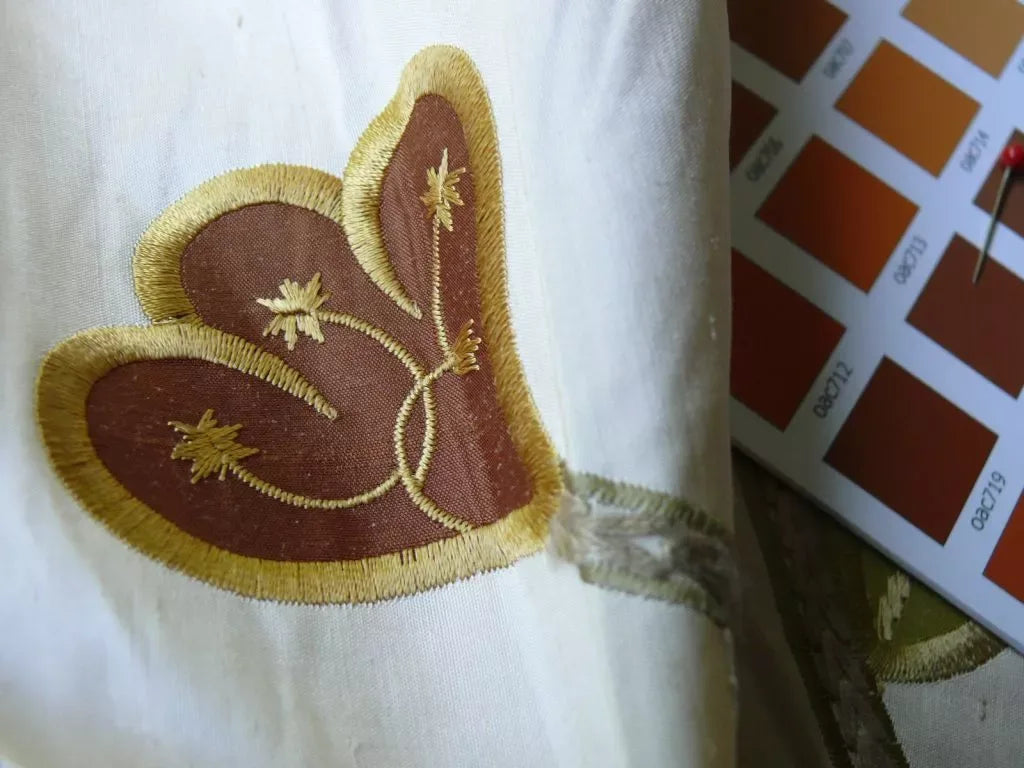 The flowers & leaves are in another silk fabric, cut off, appliqued to the base silk, them embroidered over it.