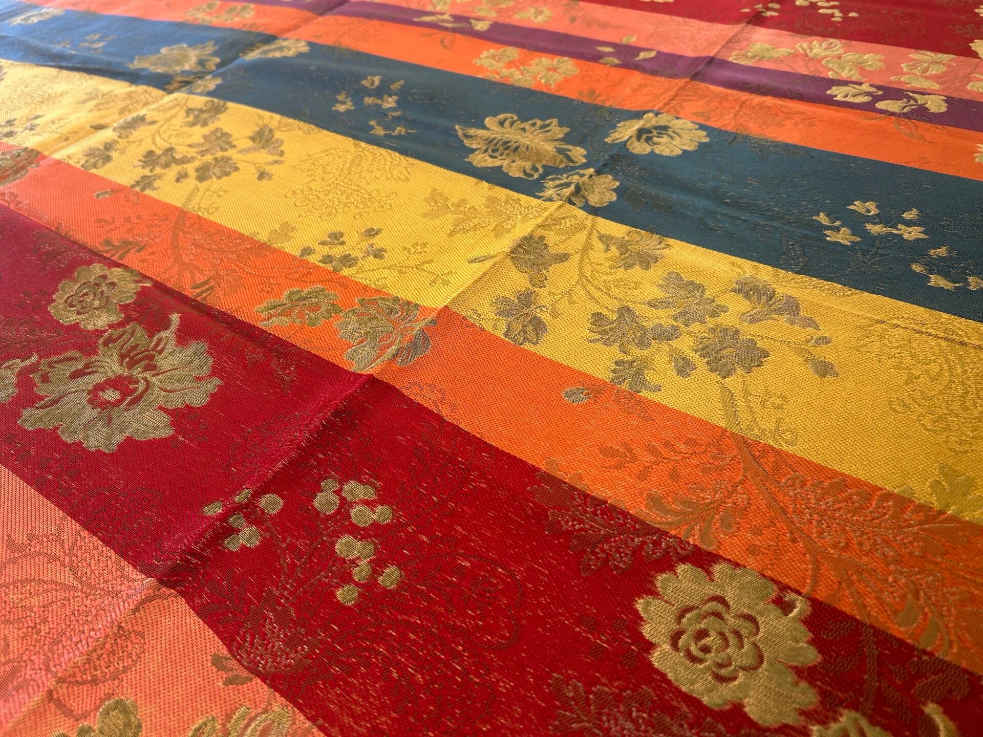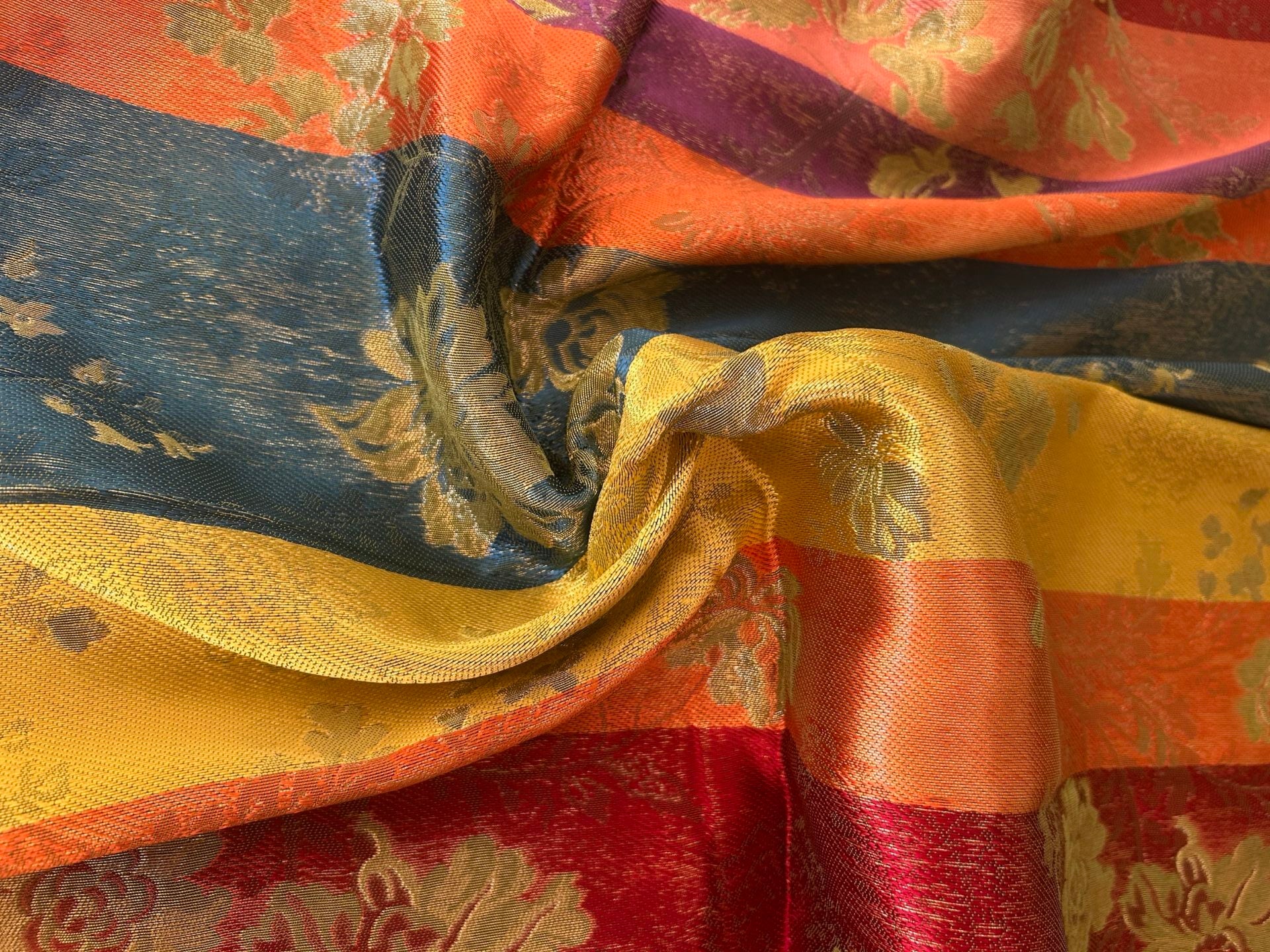 Cotton , metallic and Viscose Blend. High end lampas made in Italy. Soft yet durable. MSRP: about $200/yard.