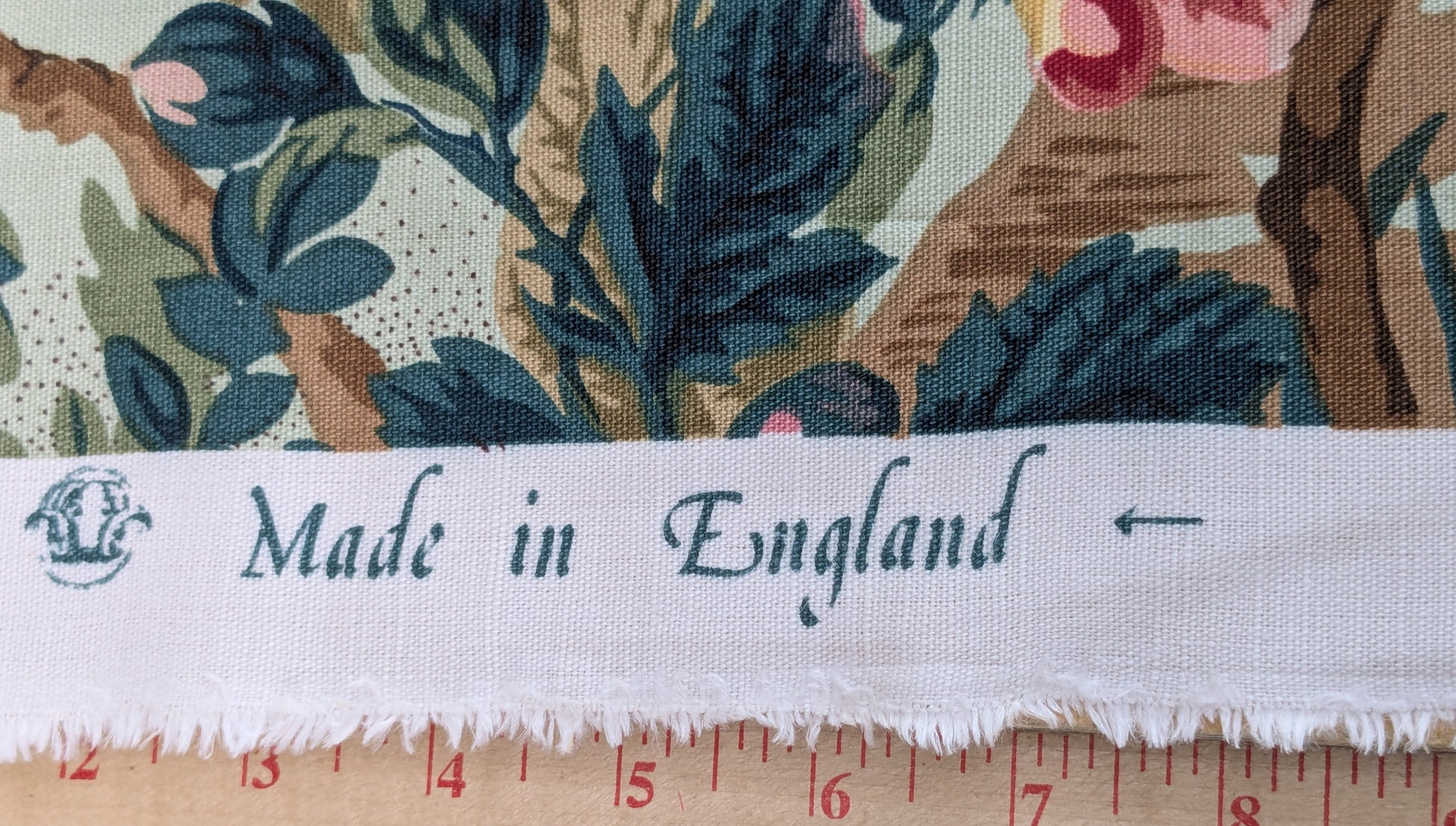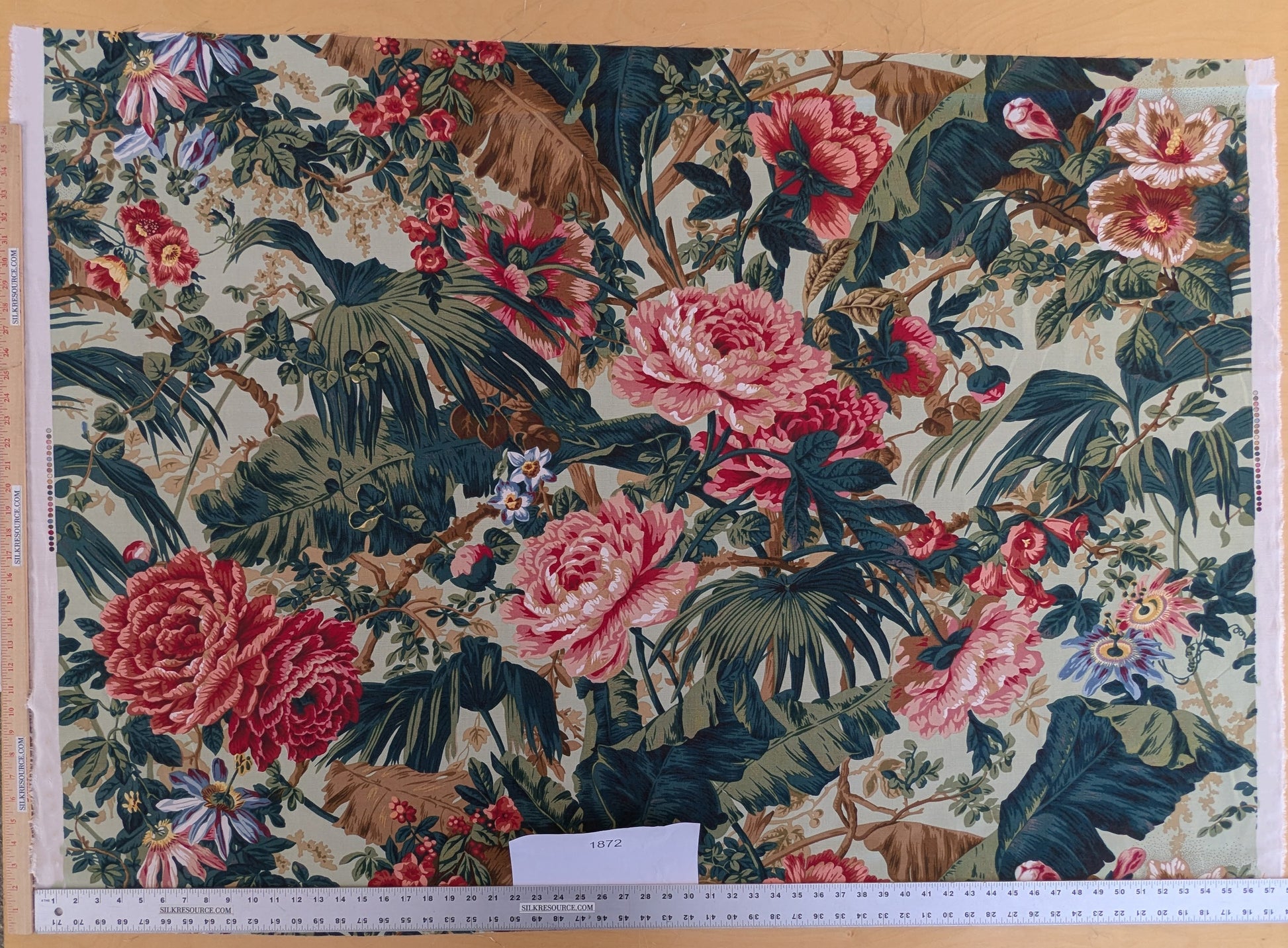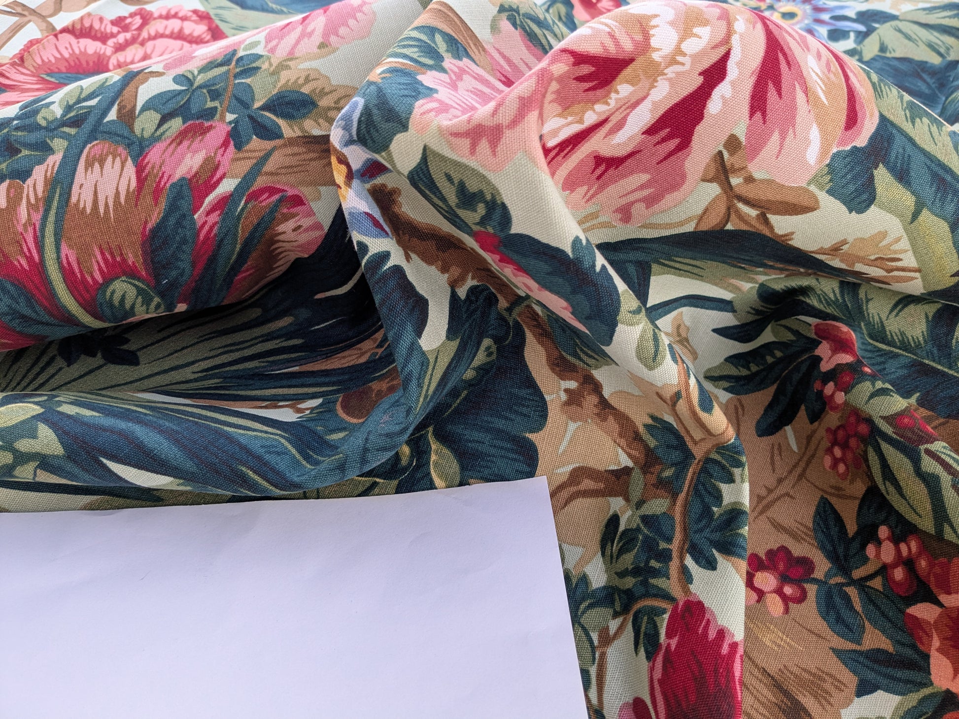 Historical Bella Flora Tropical Floral Chintz Linen Cotton Print Fabric- Pink on Green - By The Yard