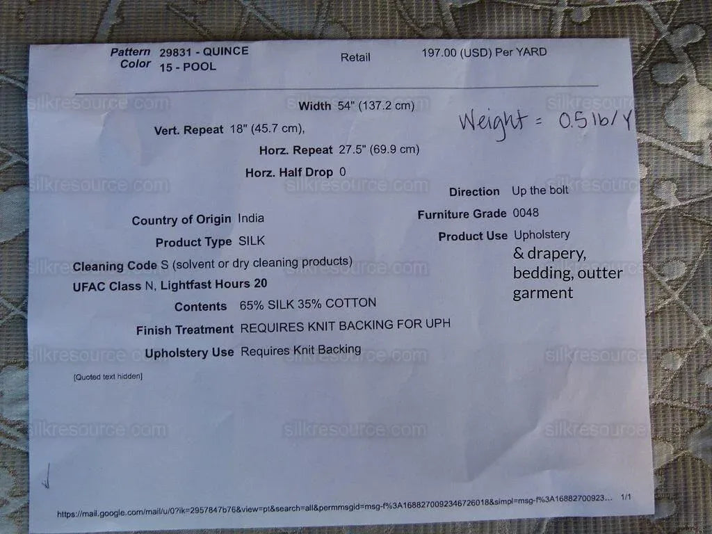 Brand, Fiber, retail price/yard, repeat, width, weight, country of origin and application: