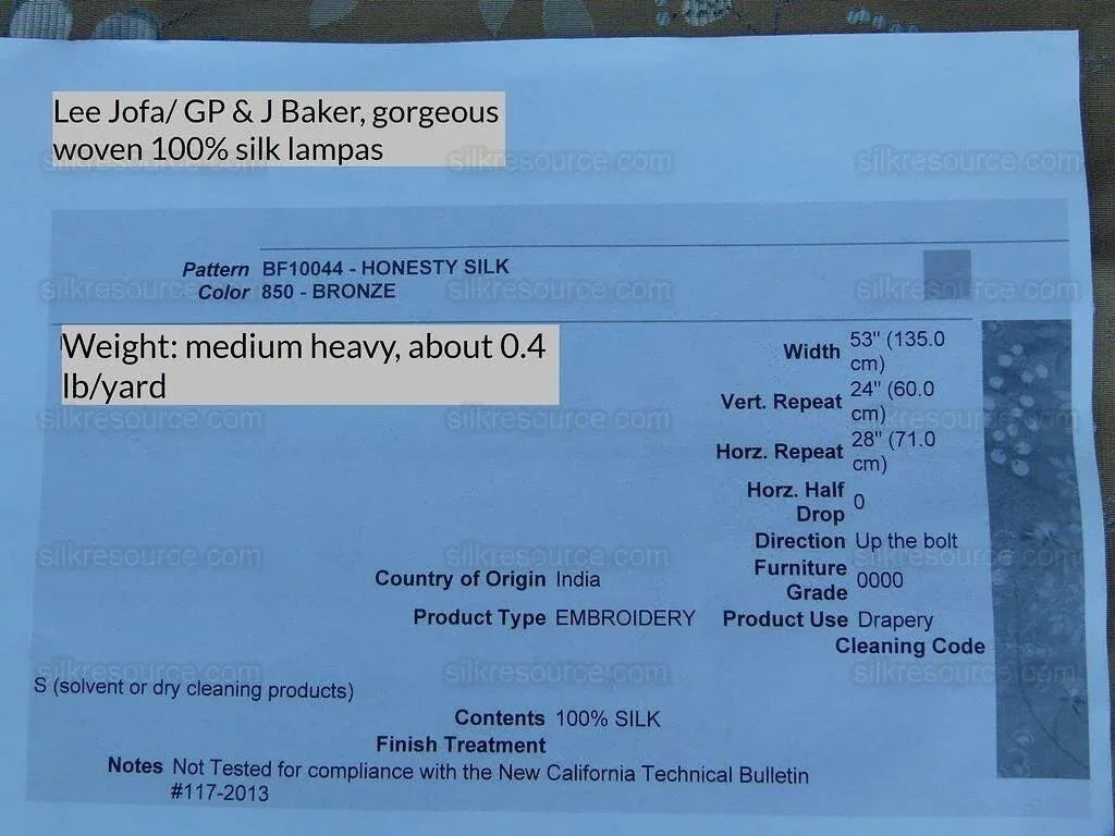 MSRP$248/yard a few years ago. Now similar silk lampas retails for about $300/yard.