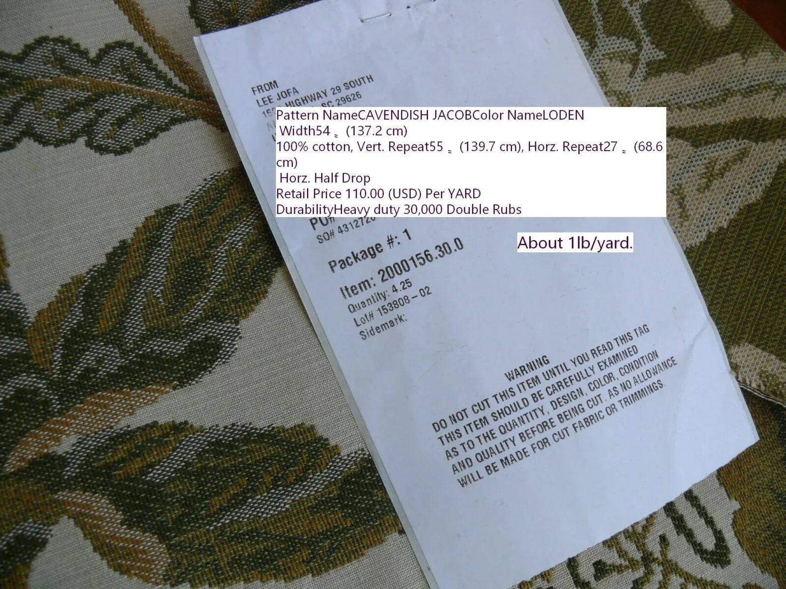 Heavy Weight: about 1 lb per yard. Application: Upholstery