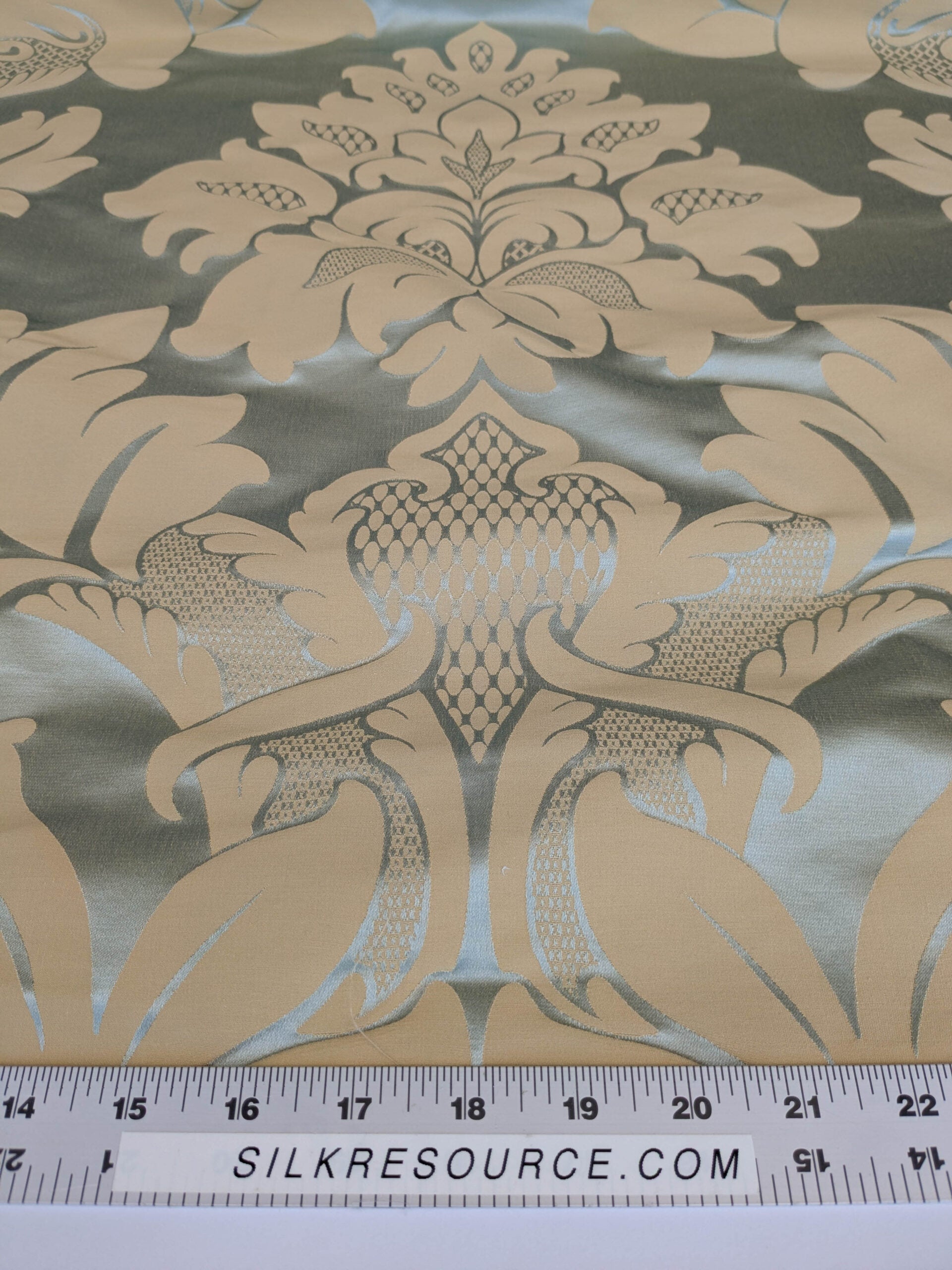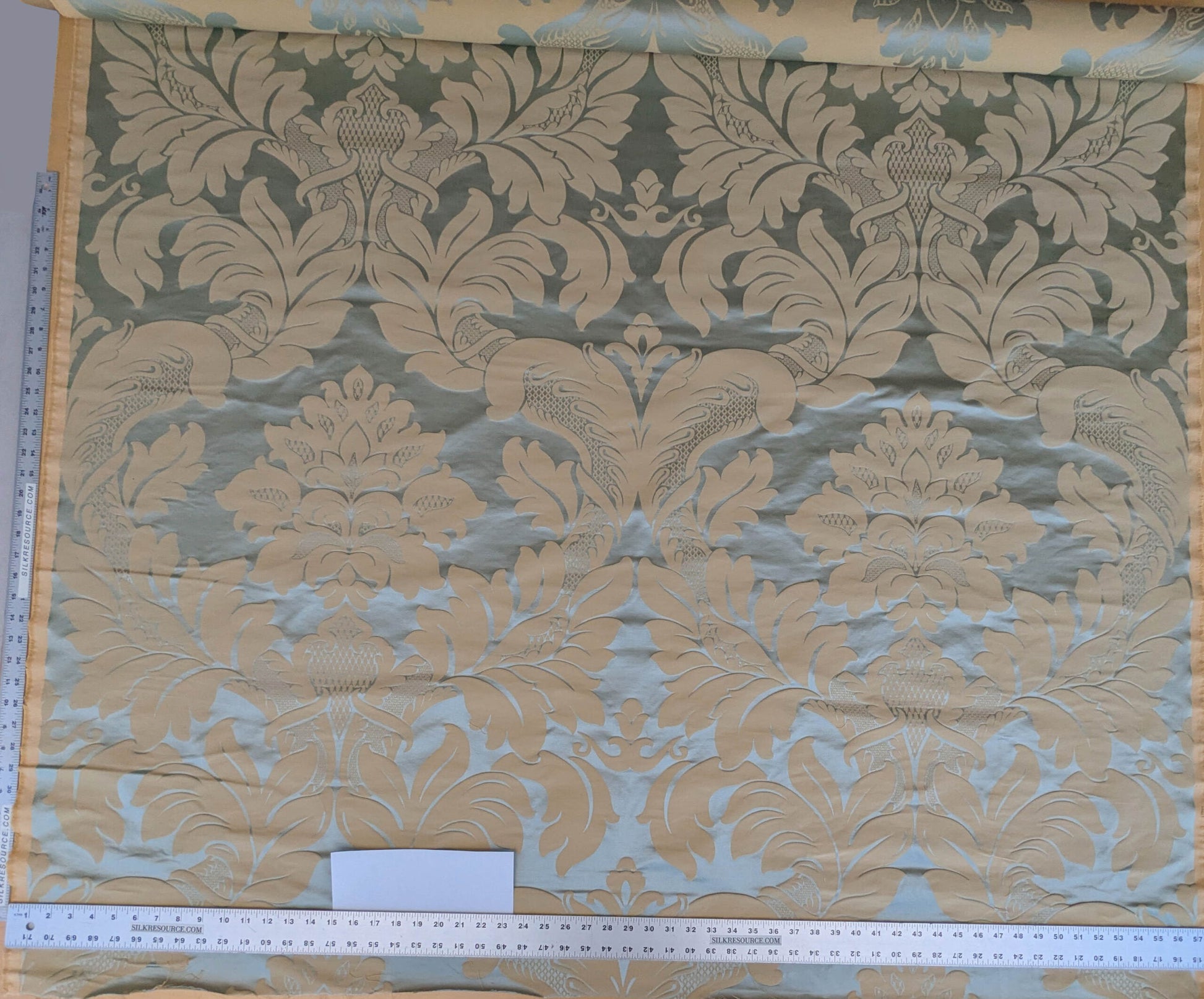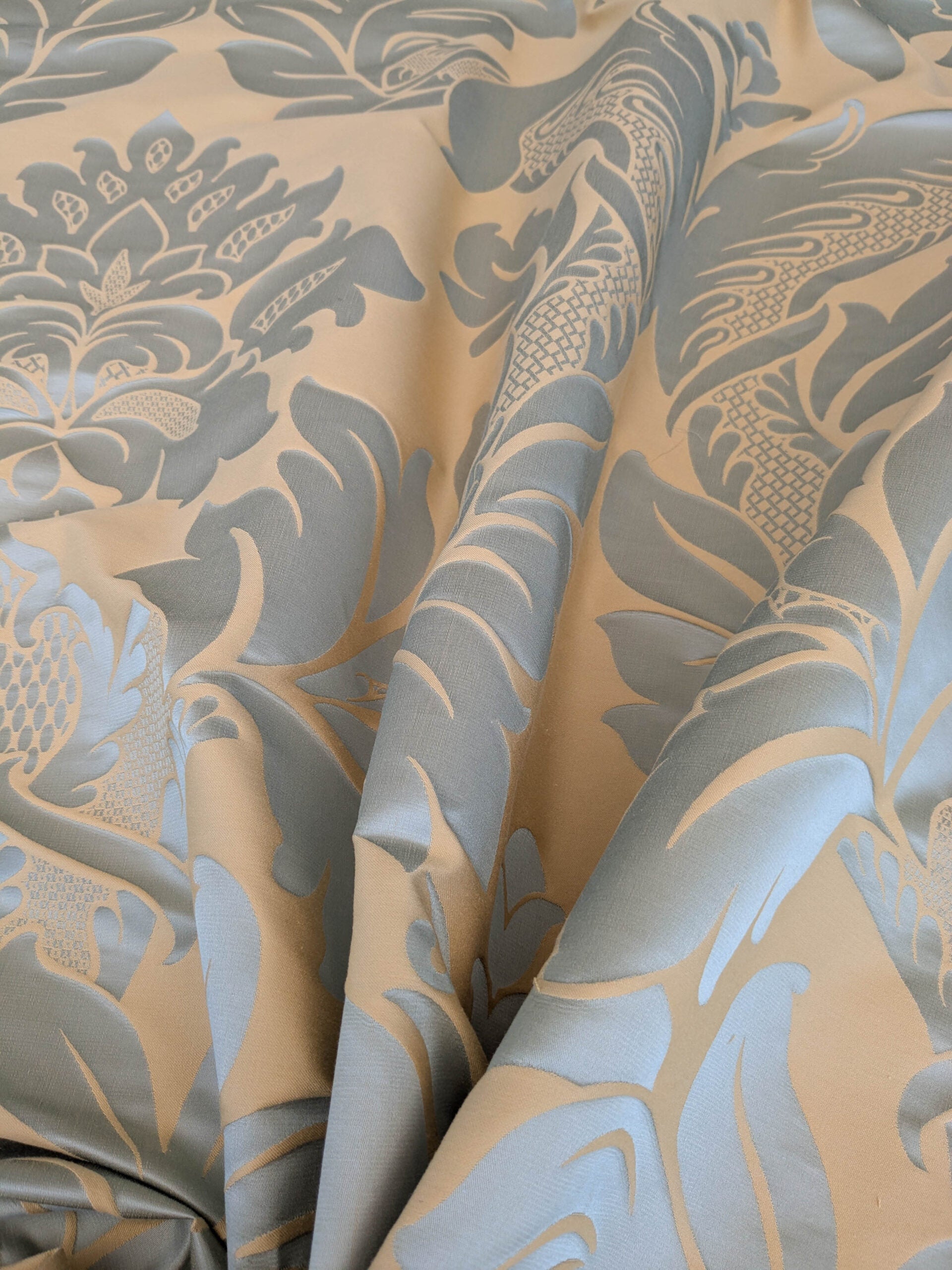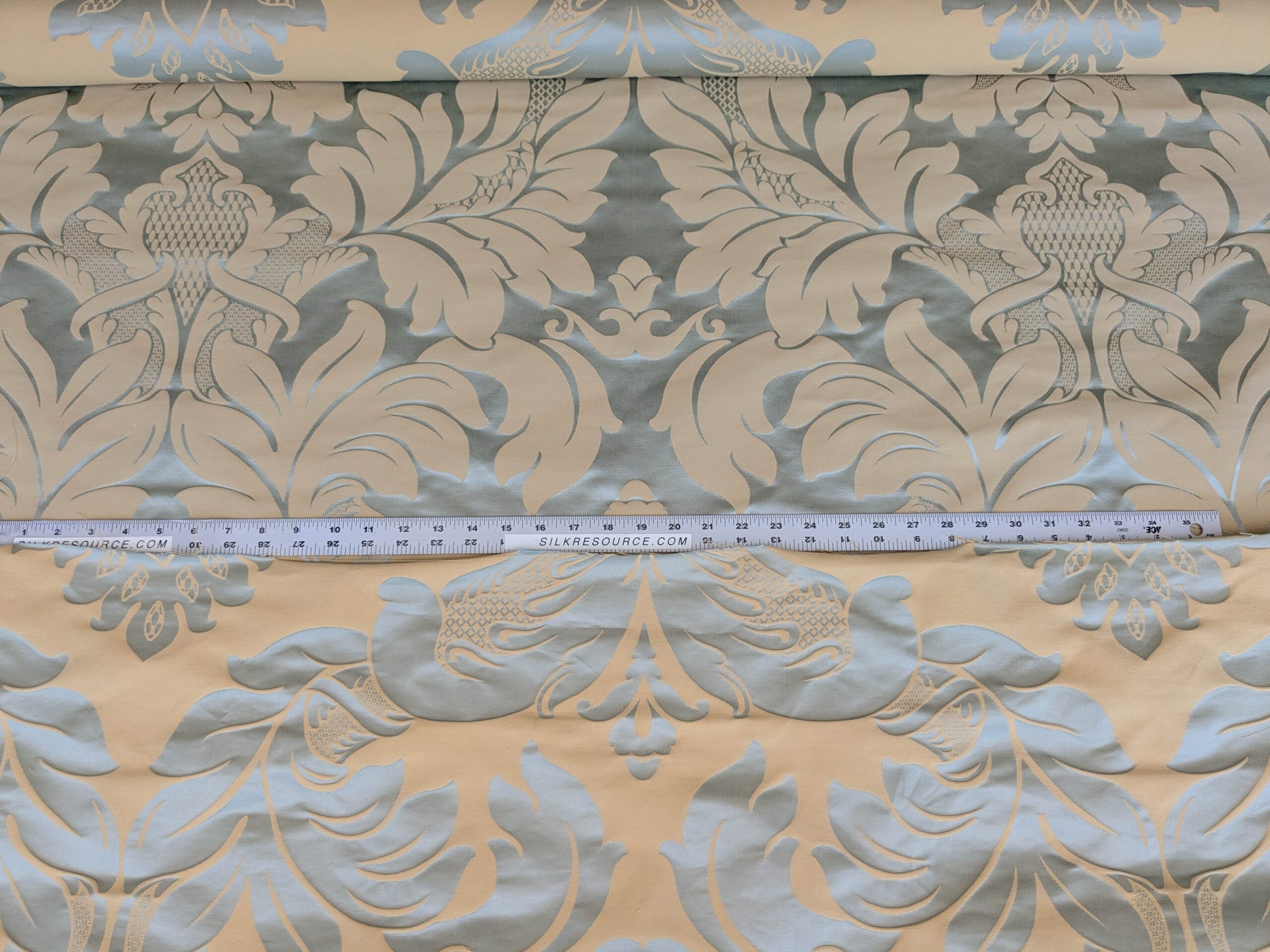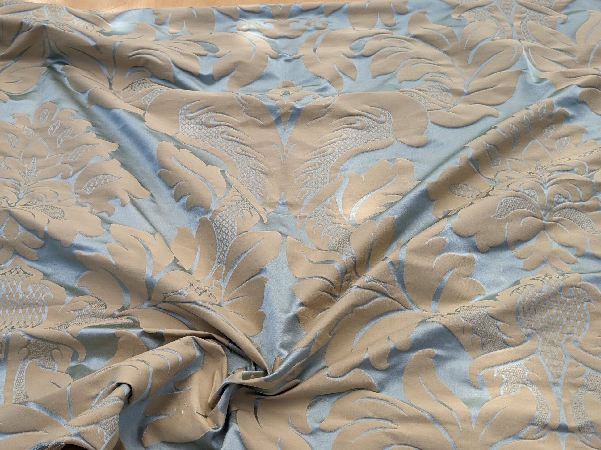 By Yard Loggia Silk Cotton Renaissance Damask Satin Aqua Light Blue Beige Highest Quality MSRP USD 500+/Y