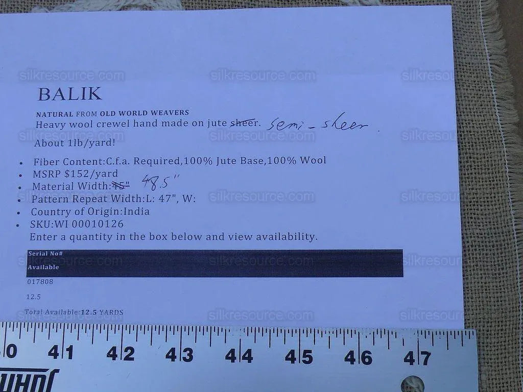 Balik is a truly timeless hand crewel. Please see the it on the screen of Elysian Bar in New Orleans www.theelysianbar.com. Wool thread is meticulously embroidered onto heavy jute basecloth. This is rather unusual because right now most similar crewel are done on cotton, yet jute was more historically accurate. This simple yet sophisticated tree of life pattern originated in India, populated to whole Europe by the British Import starting in early 1700s, then rest of the globe. Good design belongs to the world. Romantic and mesmerizing... Designer: Scalamandre / Old World Weavers. Authentic Scalamandre/Old World Weavers. Has labels from Scalamandre) MSRP$304/yard Color: "Natural". The jute is an unbleached natural linen color. Wool in white. It's "officially" a semi-sheer but the amount of light that goes through is just the same as a thinner regular cotton. It can be used as regular drapery fabric and lighter upholstery. Weight: Heavy About 1 lb per yard (regular cotton or linen for upholstery is about 0.5 lb per yard) Heavy wool crewel hand made on jute semi-sheer About 1lb/yard! (Suitable for Drapery, lighter upholstery with backing Fiber Content: C.f.a Required, 100% Jute Base, 100% wool MSRP $304/yard Material Width: 48.5" Pattern Repeat Width: L: 47",W: 48.5" Country of Origin: India Our price is way below wholesale! Drapery, upholstery, bedding, over-the-top wallcovering! Total available: see beginning of listing.