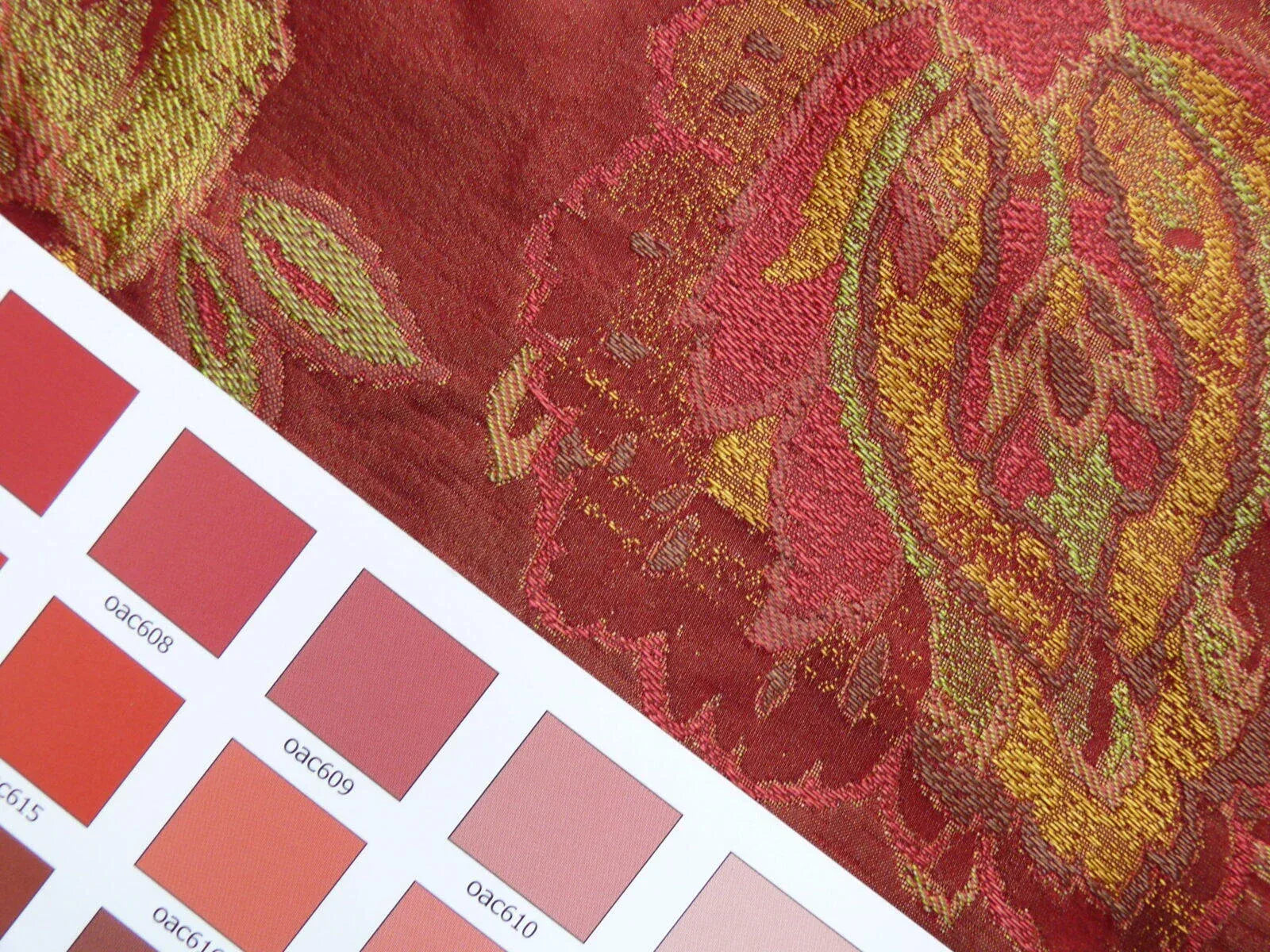 | Fabric color | "crimson", red, rich rose, pink, gold, green |