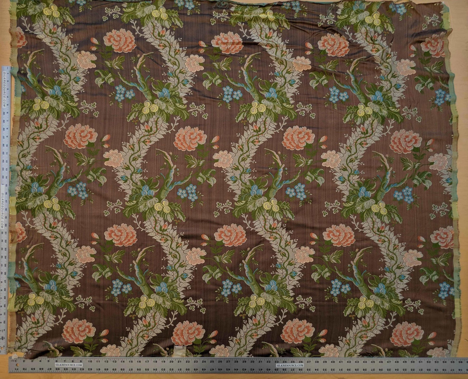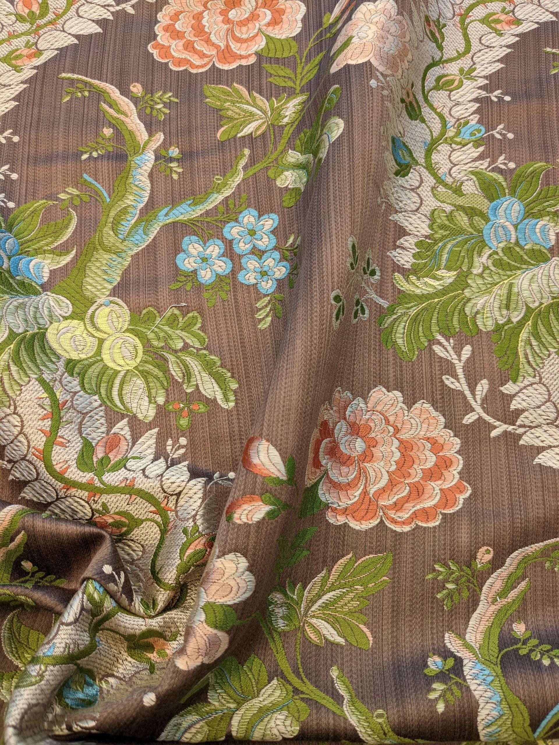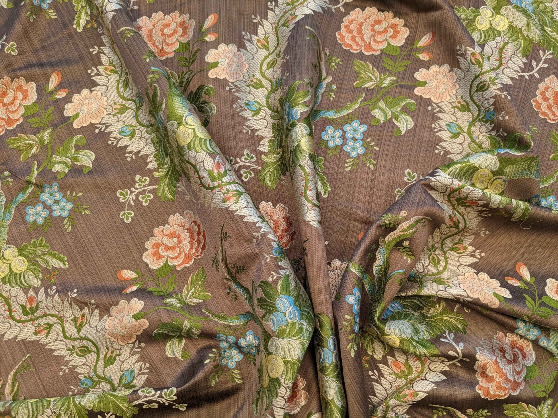 Scalamandre Mont Blanc Silk Lampas Green Gold Blue On Hazelnut Bro 56″Width x 46″ Length