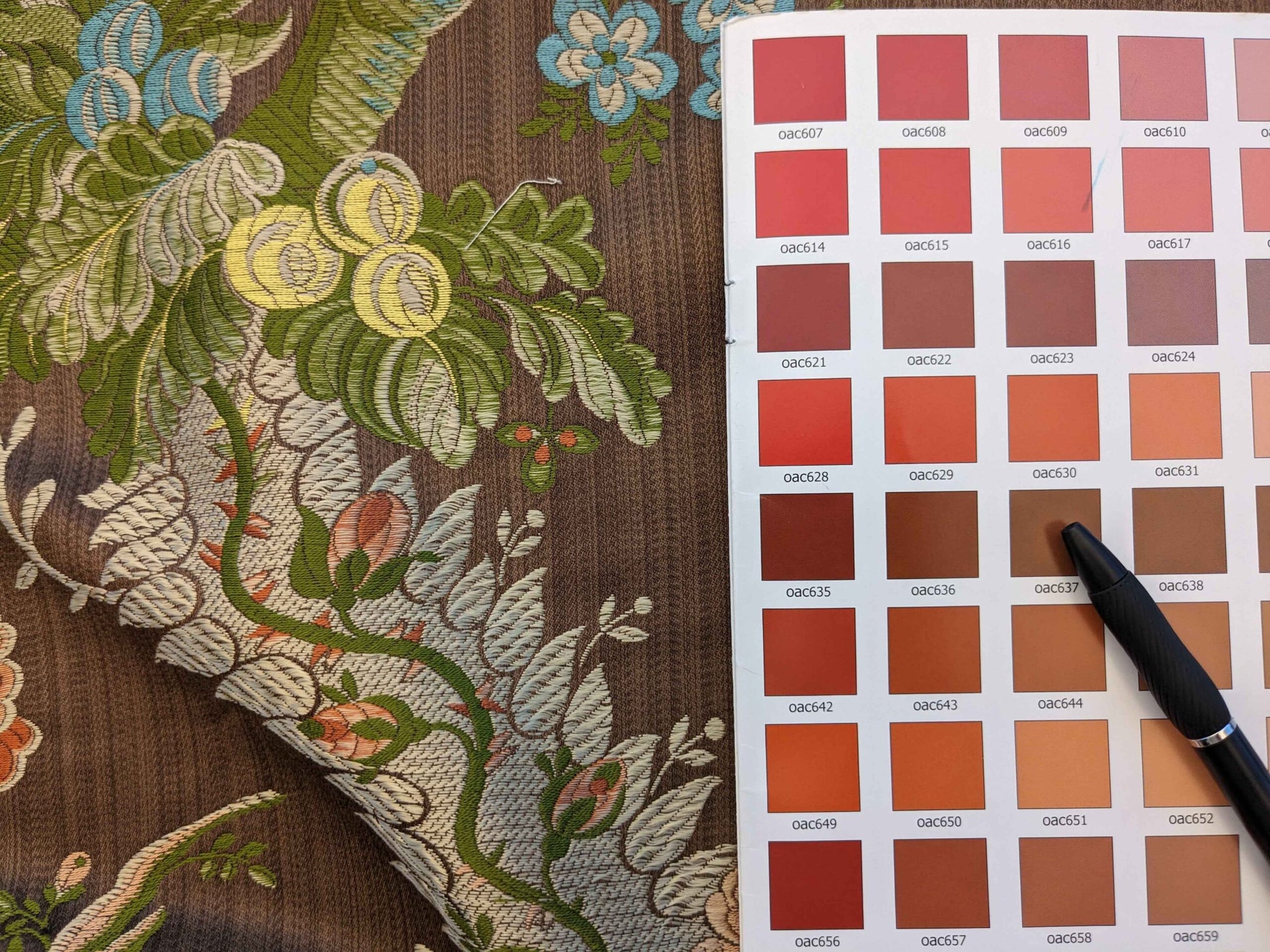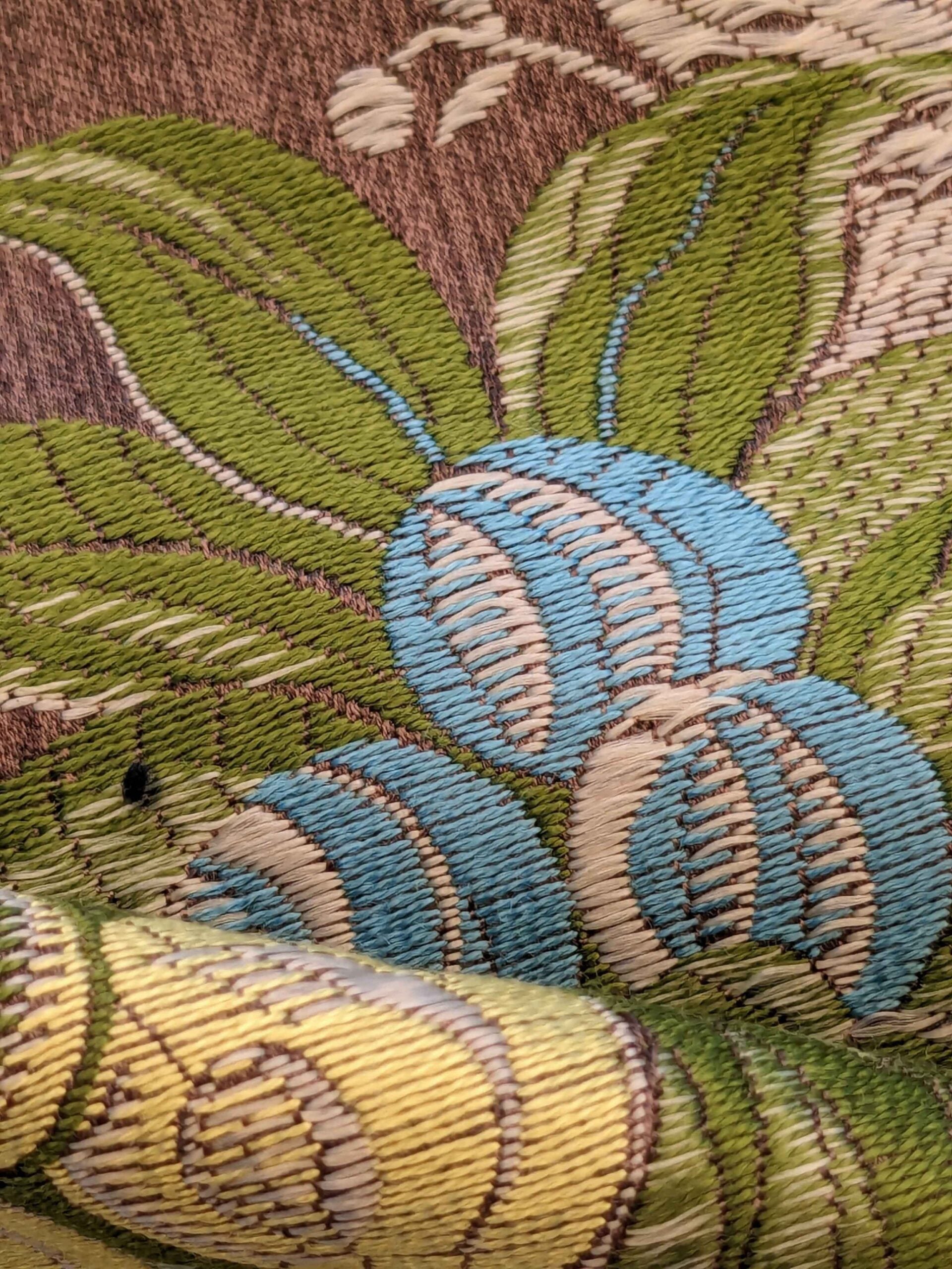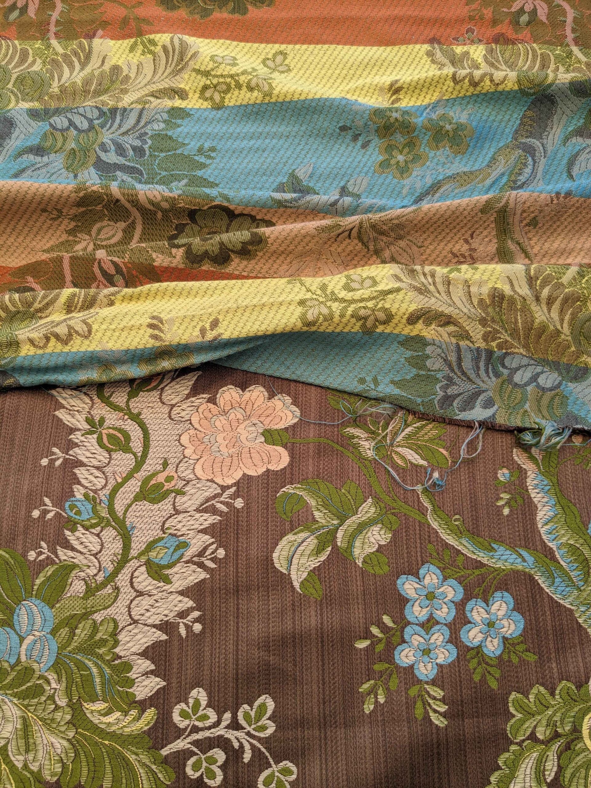 Scalamandre Mont Blanc Silk Lampas Green Gold Blue On Hazelnut Bro 56″Width x 46″ Length
