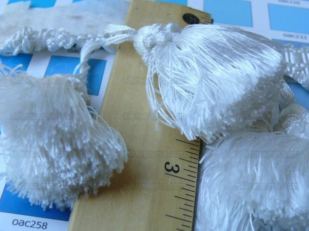 Most luxurious tassel fringe in 100% silk! Thick, lush, soft and heavy. Designer: Scalamandre About 2.6oz(73.7grams)/ yard. This weight means lots of silk yarns are used for a very full look, because silk fiber is much lighter than other fibers. Most luxurious tassel fringe in 100% silk! Designer: Scalamandre Name: Tassel Fringe, sku: FT1073M-1 Content: 100% Silk Color: WHITE Approx Width: 3.75", MSRP $259 per yard