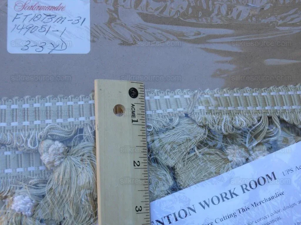 Total Available: 50y, piece 149051-3 50y, piece 149051-2 Most luxurious tassel fringe in 100% silk! Thick, lush, soft and heavy. Designer: Scalamandre About 2.6oz(73.7grams)/ yard. This weight means lots of silk yarns are used for a very full look, because silk fiber is much lighter than other fibers. Name: Tassel Fringe, sku: FT1073M-031, Tassel Fringe 100% Silk Color: Wheat & White Approx Width: 3.75", MSRP $259 per yard