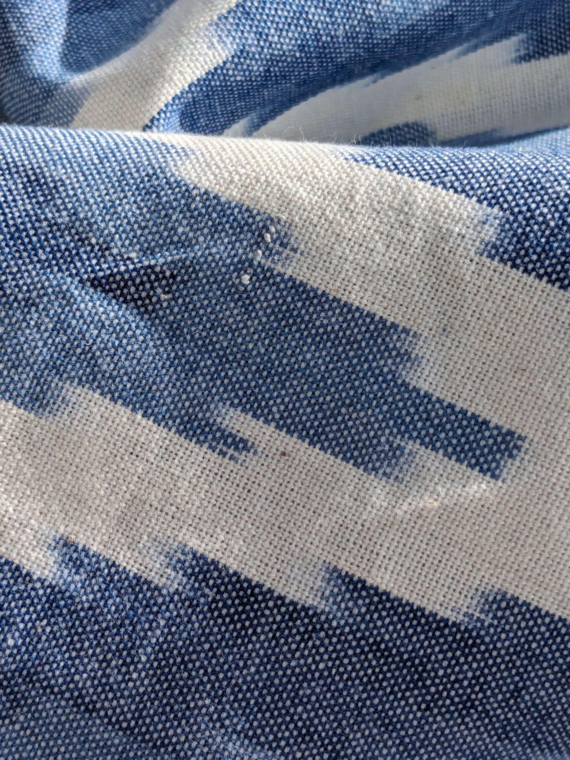 colors forming the feathered motif. The soft cotton warp is dyed by