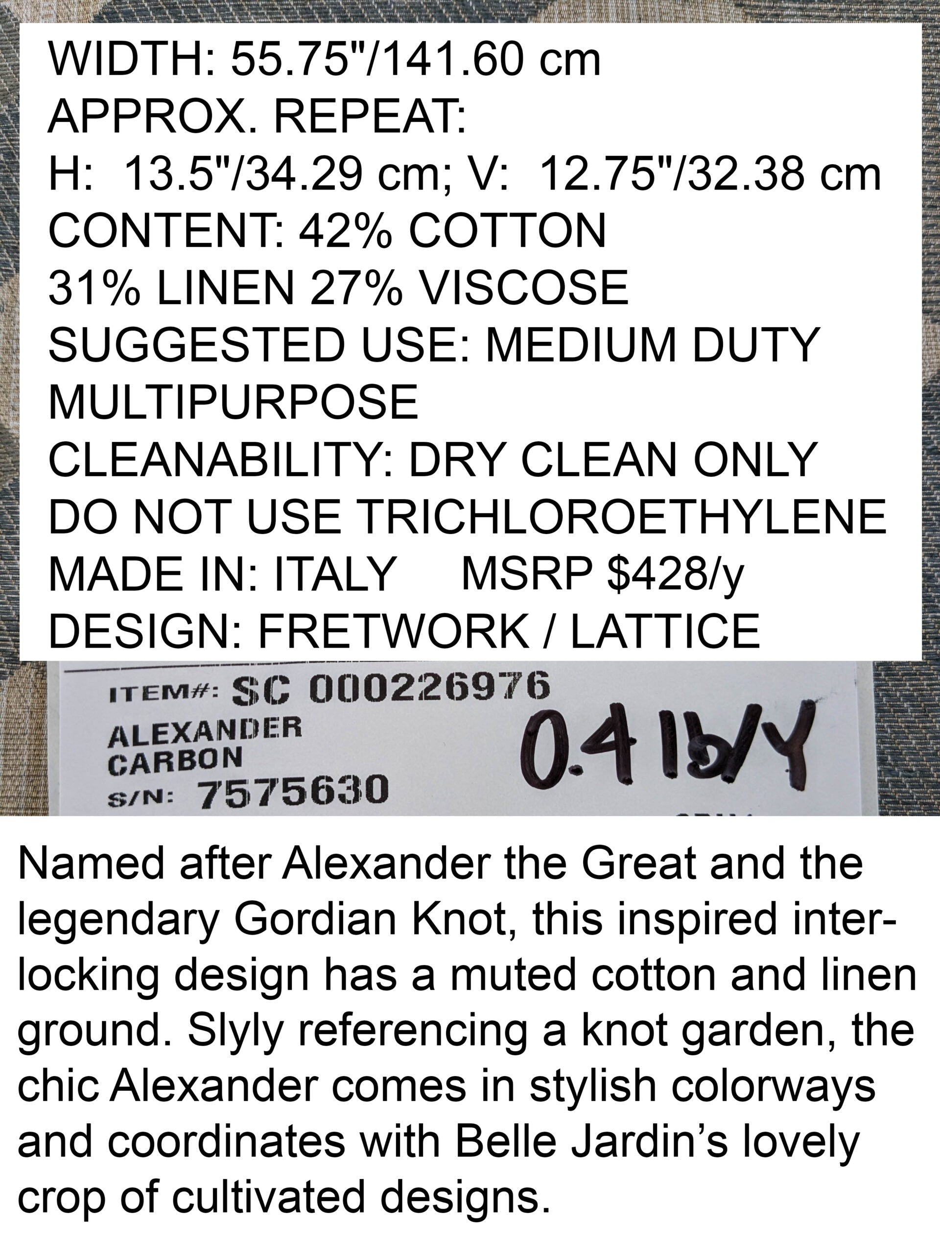 DESIGN INSPIRATION Named after Alexander the Great and the legendary Gordian Knot, this inspired interlocking design has a muted cotton and linen ground. Slyly referencing a knot garden, the chic Alexander comes in stylish colorways and coordinates with Belle Jardin’s lovely crop of cultivated designs.Approx. Material Width: 55.75" / 141.60 Cm Approx. Repeat: Horizontal 13.5"/34.29 Cm; Vertical 12.75" / 32.38 Cm Content: 42% Cotton 31% Linen 27% Viscose Suggested Use: Medium Duty Multipurpose Cleanability: Do Not Tumble Dry Dry Clean Only Do Not Use Trichloroethylene Permanent Press Warm Iron Wash In Cold Water Made In Italy Design: Fretwork / Lattice; Geometric |