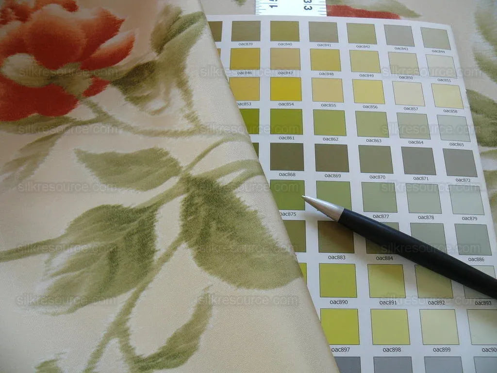 Color: The background is a warm beige, reminiscent of aged parchment or soft sand. The floral print features layered shades of muted terracotta, coral rose, and creamy ivory, softened with olive and sage greens. There’s a subtle watercolor-like blending in the petals, while the foliage fades into cool, dusty green.