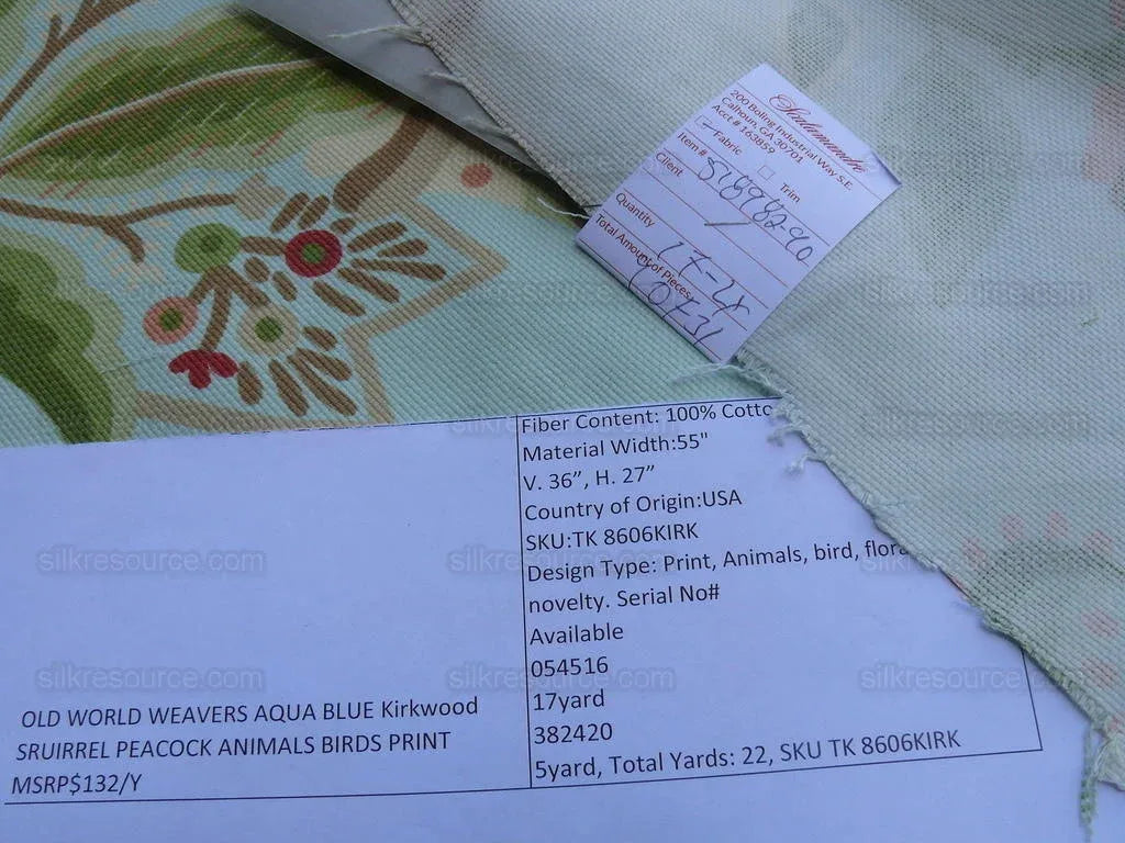 Designer: Scalamandre/Old World Weavers Heavy weight cotton print. Photos cannot capture its beauty...Adorable animals in mythical woods. Squirrels and peacocks in Tree of Life . Our price is below wholesale and even production cost! Superb quality. The simplicity and boldness in the print is so refreshing. Color, repeat, fiber content, applications & retail price: please see the printout in photo.