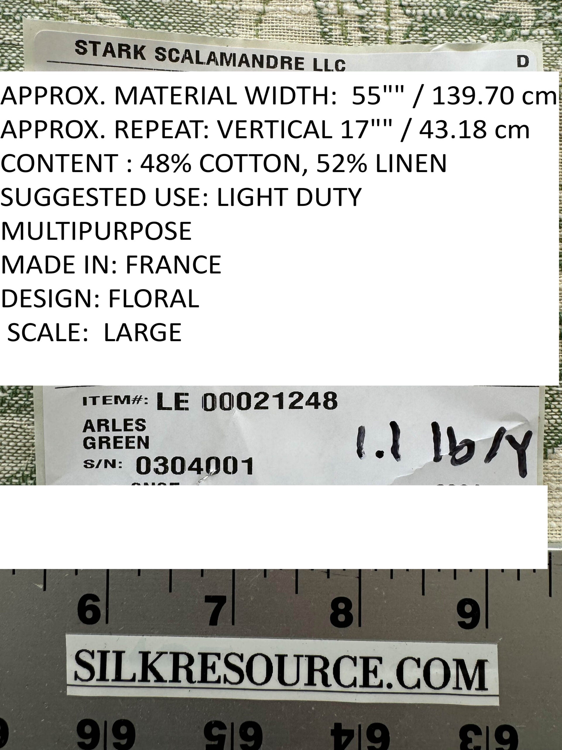 | APPROX. MATERIAL WIDTH: 55" / 139.70 cm APPROX. REPEAT: VERTICAL 17" / 43.18 cm CONTENT : 48% COTTON, 52% LINEN SUGGESTED USE: LIGHT DUTY MULTIPURPOSE MADE IN: FRANCE DESIGN: FLORAL SCALE: LARGE |