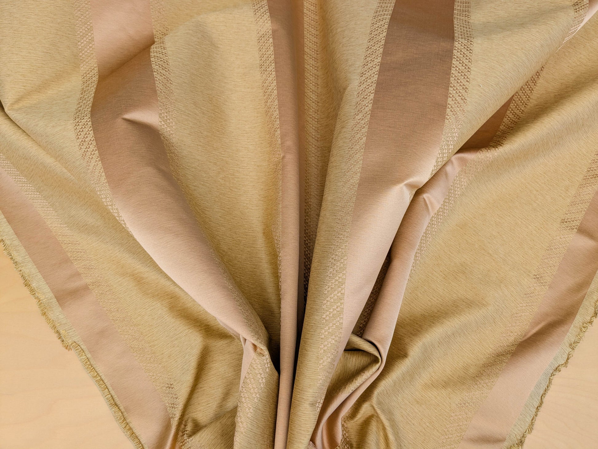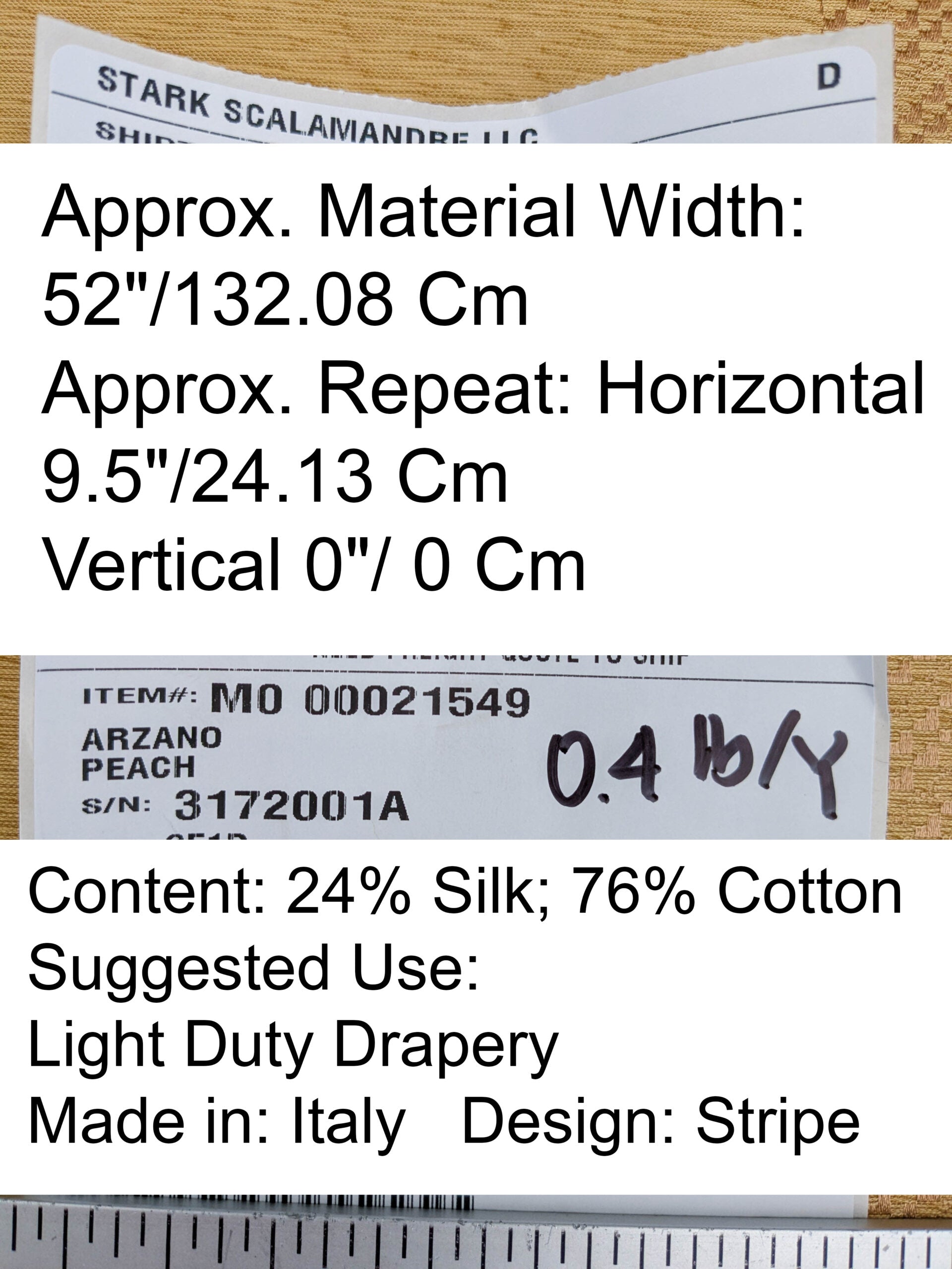 Approx. Material Width: 52"/132.08 Cm Approx. Repeat: Horizontal 9.5"/24.13 Cm; Vertical 0"/ 0 Cm Content: 24% Silk; 76% Cotton Suggested Use: Light Duty Drapery Made in: Italy Design: Stripe |