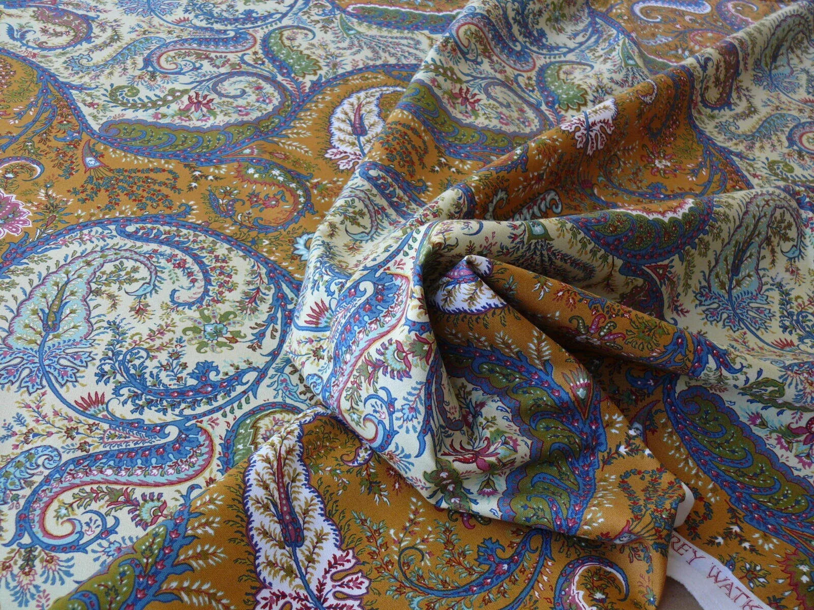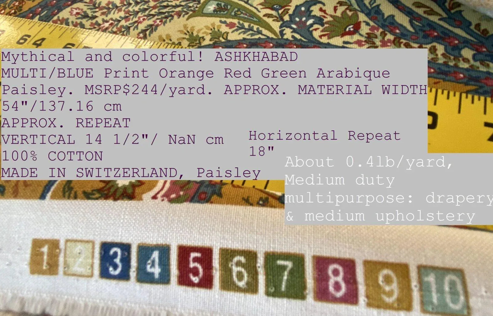 | Intricate Arabisque Paisley print. MSRP $244/yard a few years ago. Similar quality now retails for about $300/yard. Multi/olive green Fiber Content:100% Cotton Material Width:54" Pattern Repeat Width:Vert: 14 1/2", Horiz: 18" Country of Origin: Switzerland SKU:M7 0001 1520 |