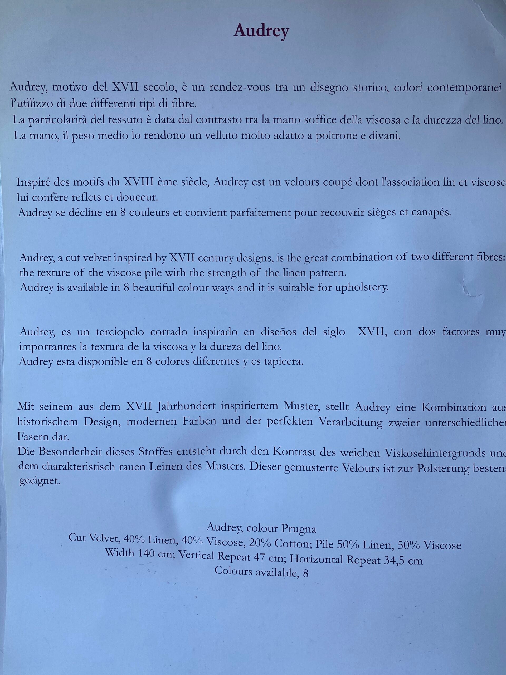 "Audrey, a cut velvet inspired by Xv II century design, is the great combination of two difference fibres, the texture of the viscose pile with the strength of the linen pattern. "