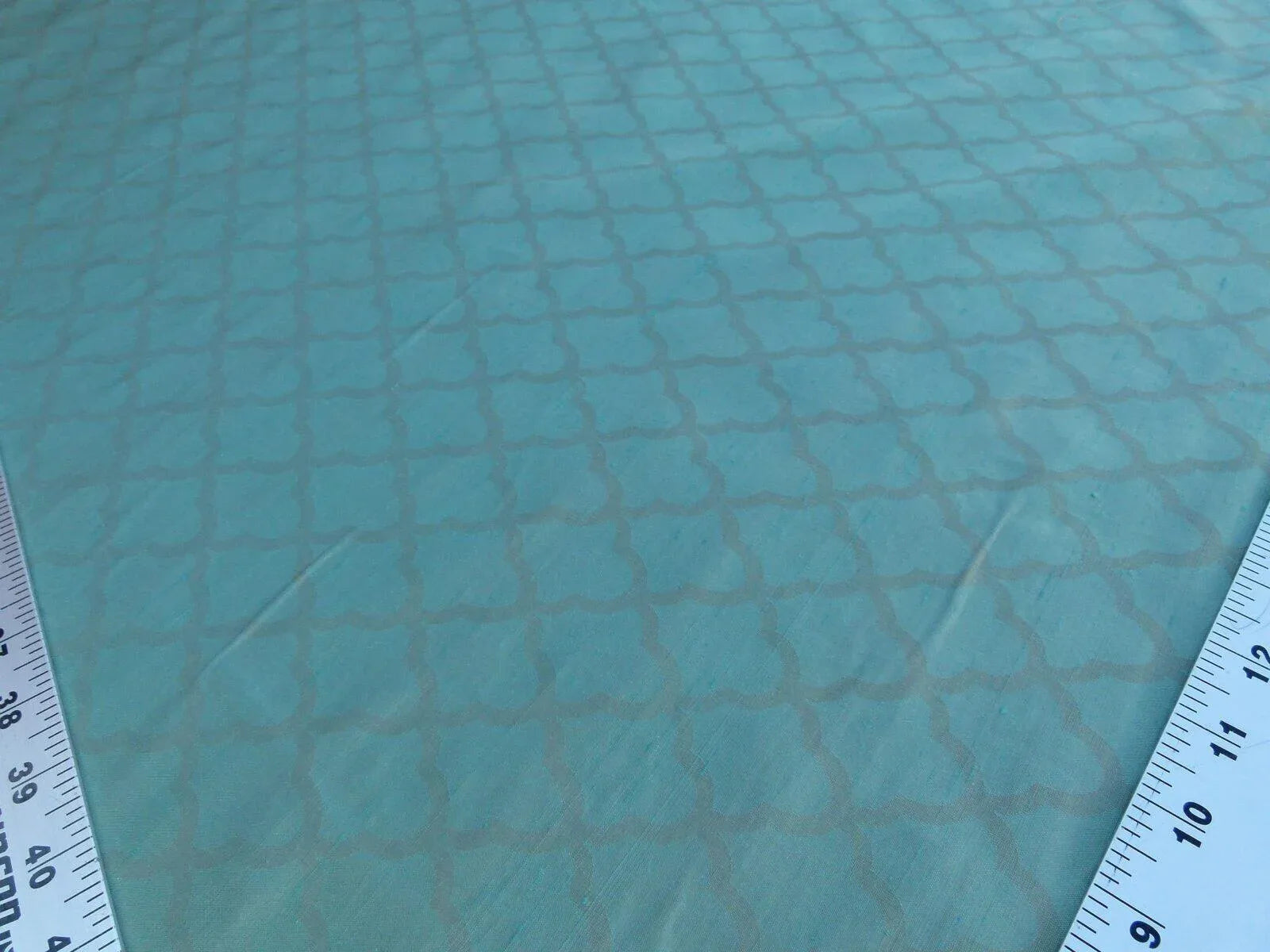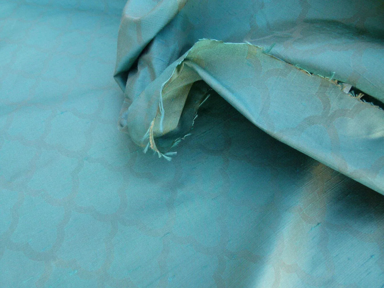 Fish scale or window lattice, ocean wave or clouds? Fully reversible. Weight: about 0.4lb/yard. Great weight and hand. 100% silk, Width 55″, HR1.75″, VR 2″. Country of Origin: India. MSRP USD 148/Yard years ago. Now similar silk damask retails for $200+/yard. Application: drapery, light duty upholstery.