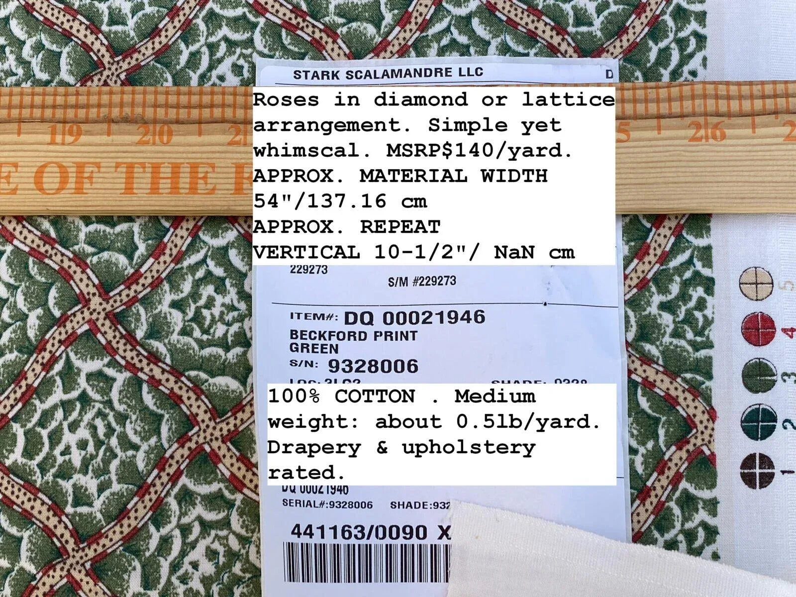 Scalamandre Beckford Print Green Rose In Diamond Square Cotton MSRP USD 140/Y