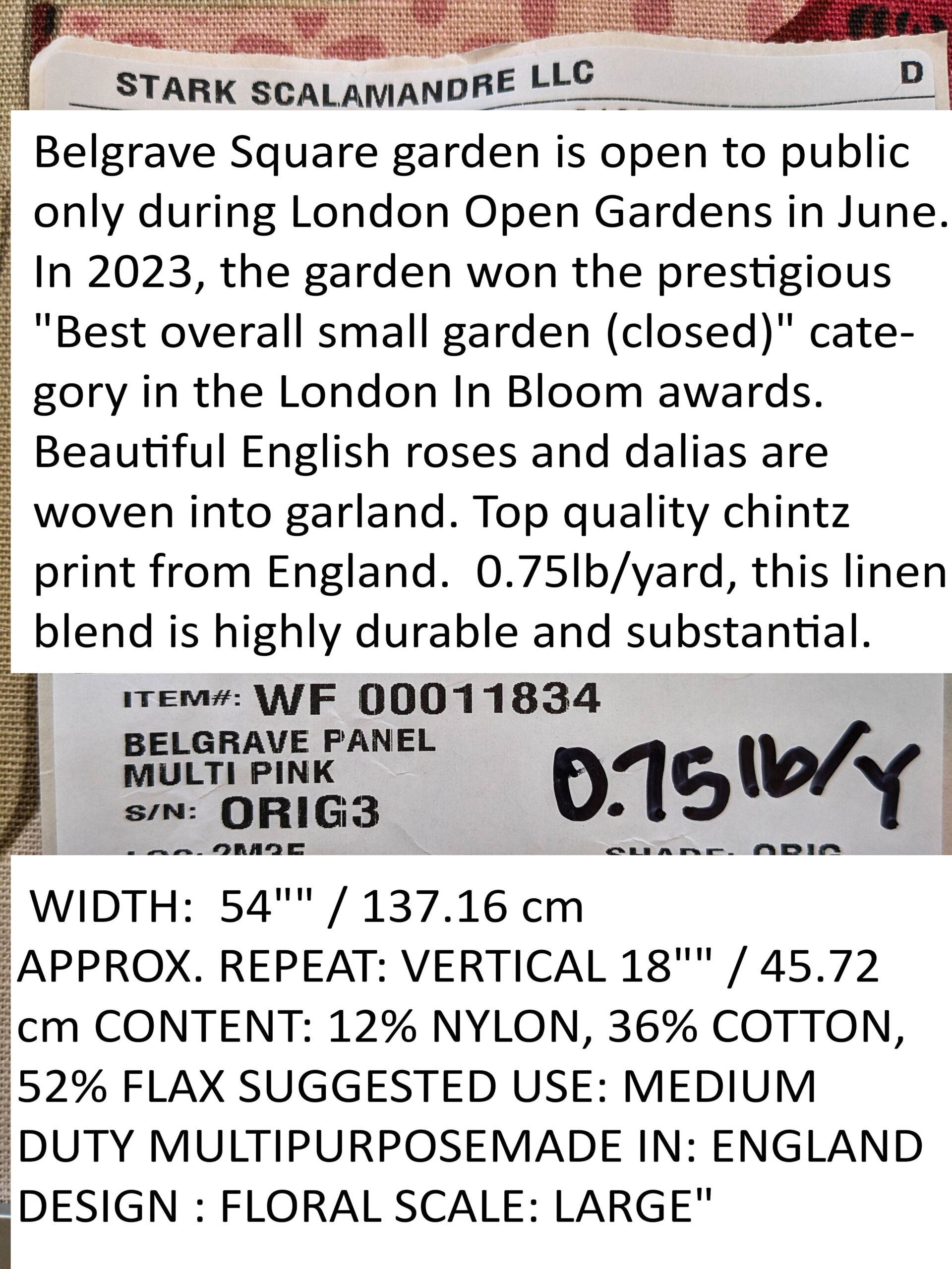 | Belgrave Square garden is open to public only during London Open Gardens in June. In 2023, the garden won the prestigious "Best overall small garden (closed)" category in the London In Bloom awards. Beautiful English roses and dalias are woven into garland. Top quality chintz print from England. 0.75lb/yard, this linen blend is highly durable and substantial. |