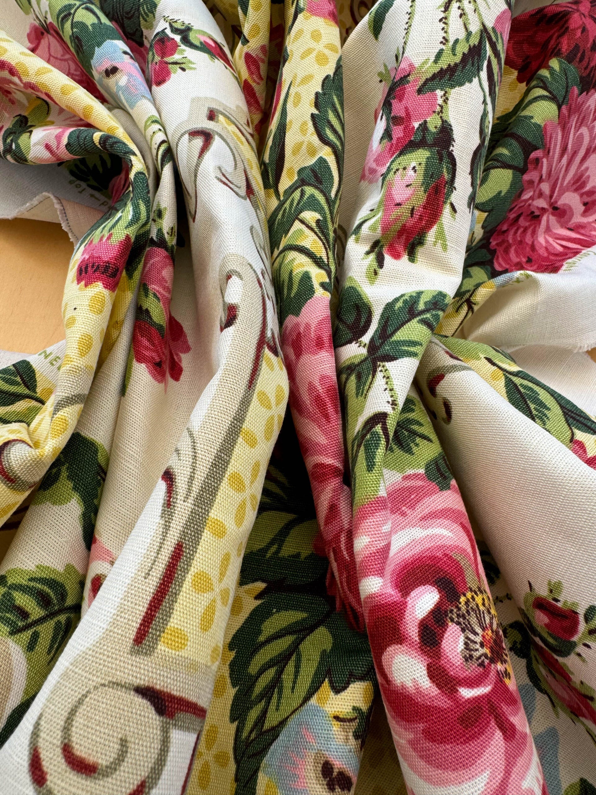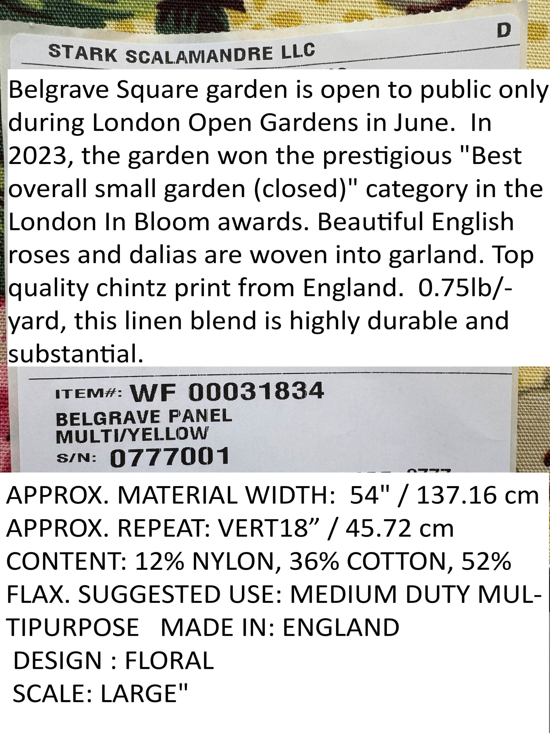 Belgrave Square garden is open to public only during London Open Gardens in June. In 2023, the garden won the prestigious "Best overall small garden (closed)" category in the London In Bloom awards. Beautiful English roses and dalias are woven into garland. Top quality chintz print from England. 0.75lb/yard, this linen blend is highly durable and substantial. |