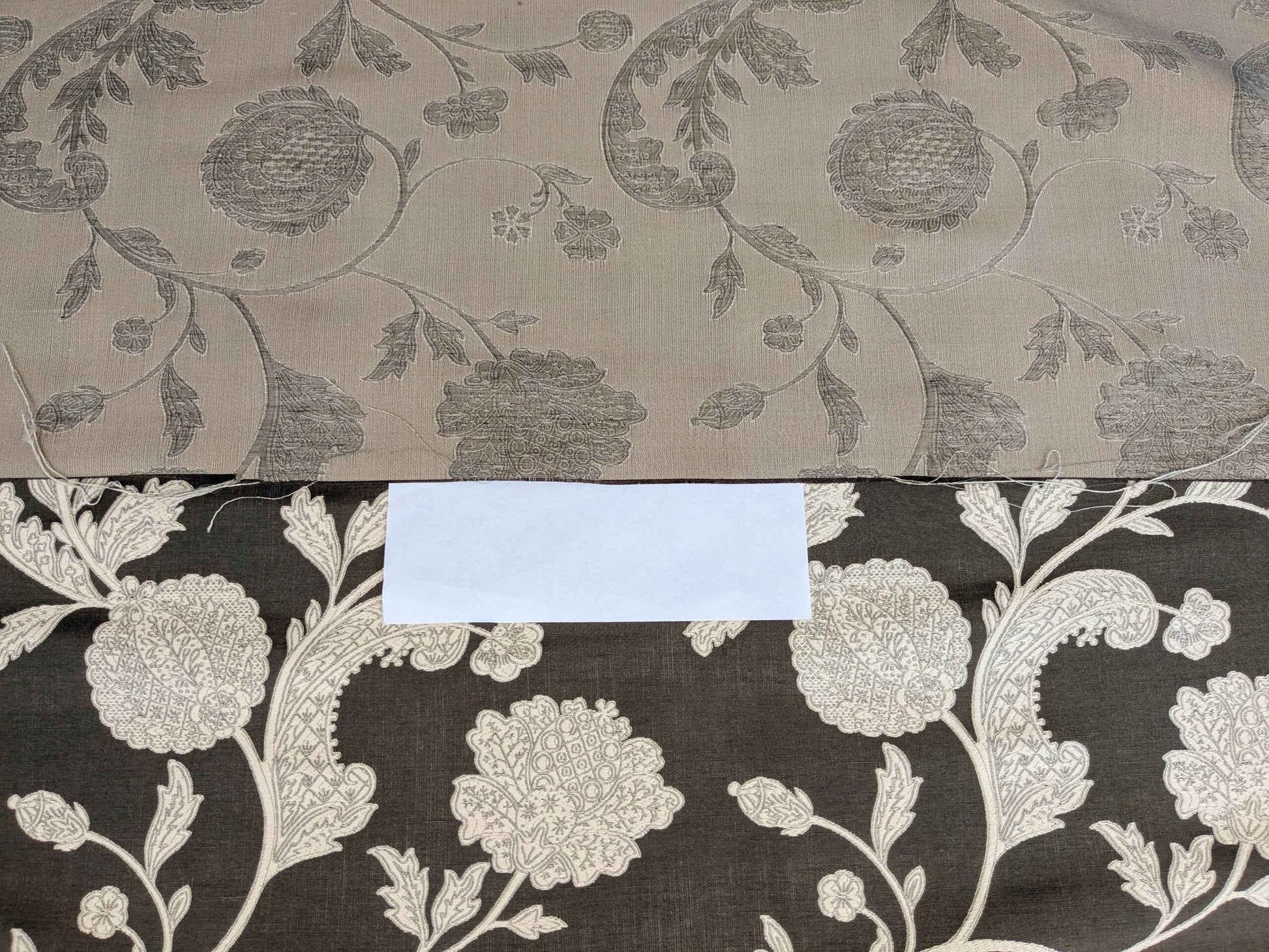 The jacquard, very thick and durable, totals to 0.8lb/yard! This is a weight almost like a velvet. Official colorway is "Ivory on Bitter Chocolate" yet the bitter chocolate is so dark that it's almost black. The ivory also shines like silver. MSRP $400+/yard