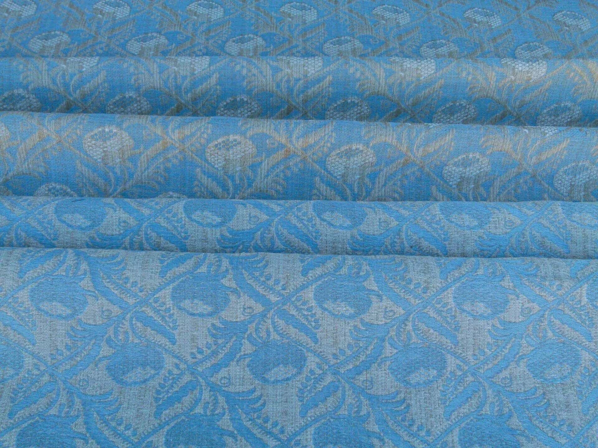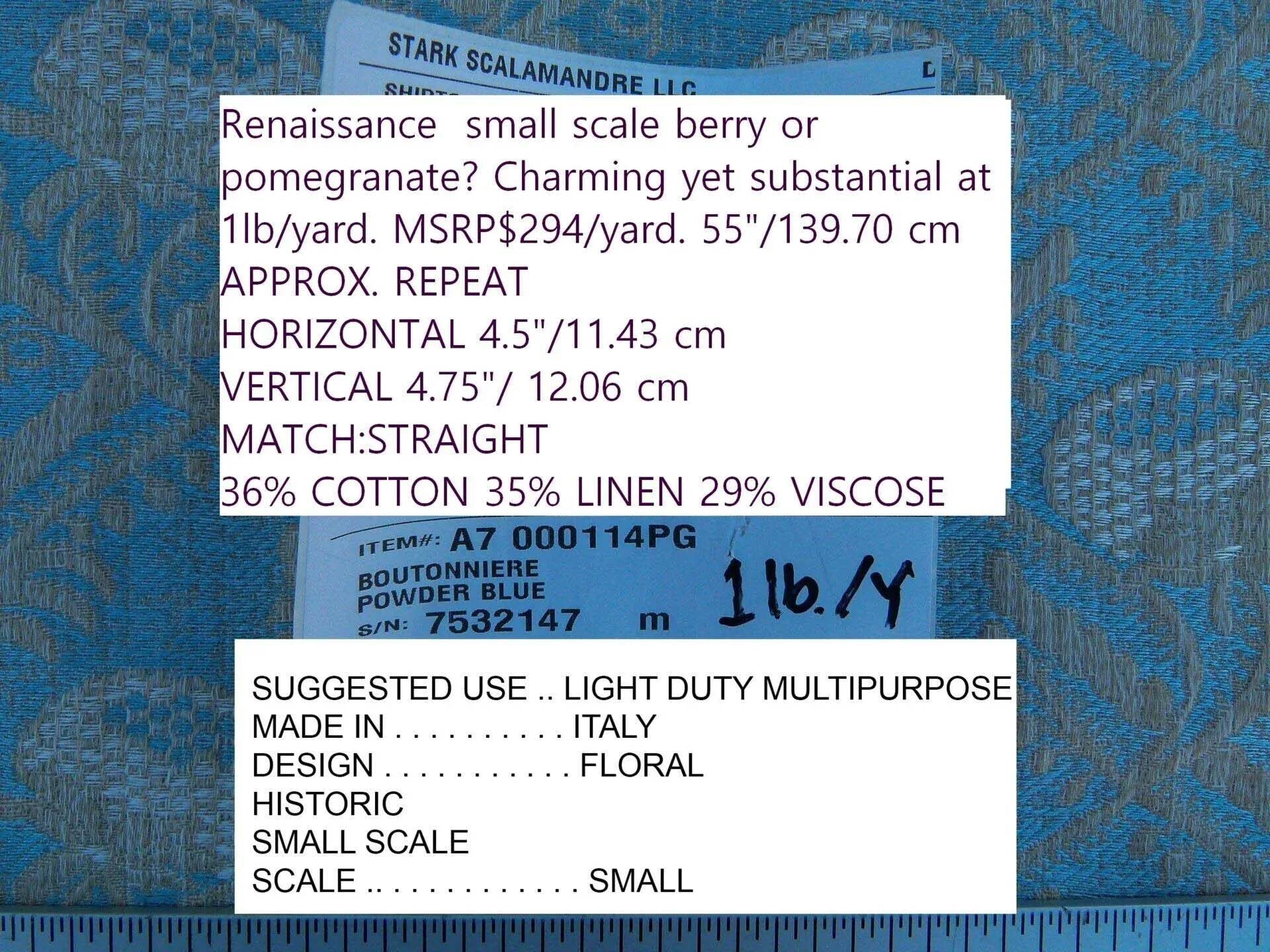 Scalamandre Boutonniere Powder Blue Renaissance Small Scale Berry Pomegranate Jacquard Cotton Linen MSRP USD 402/y