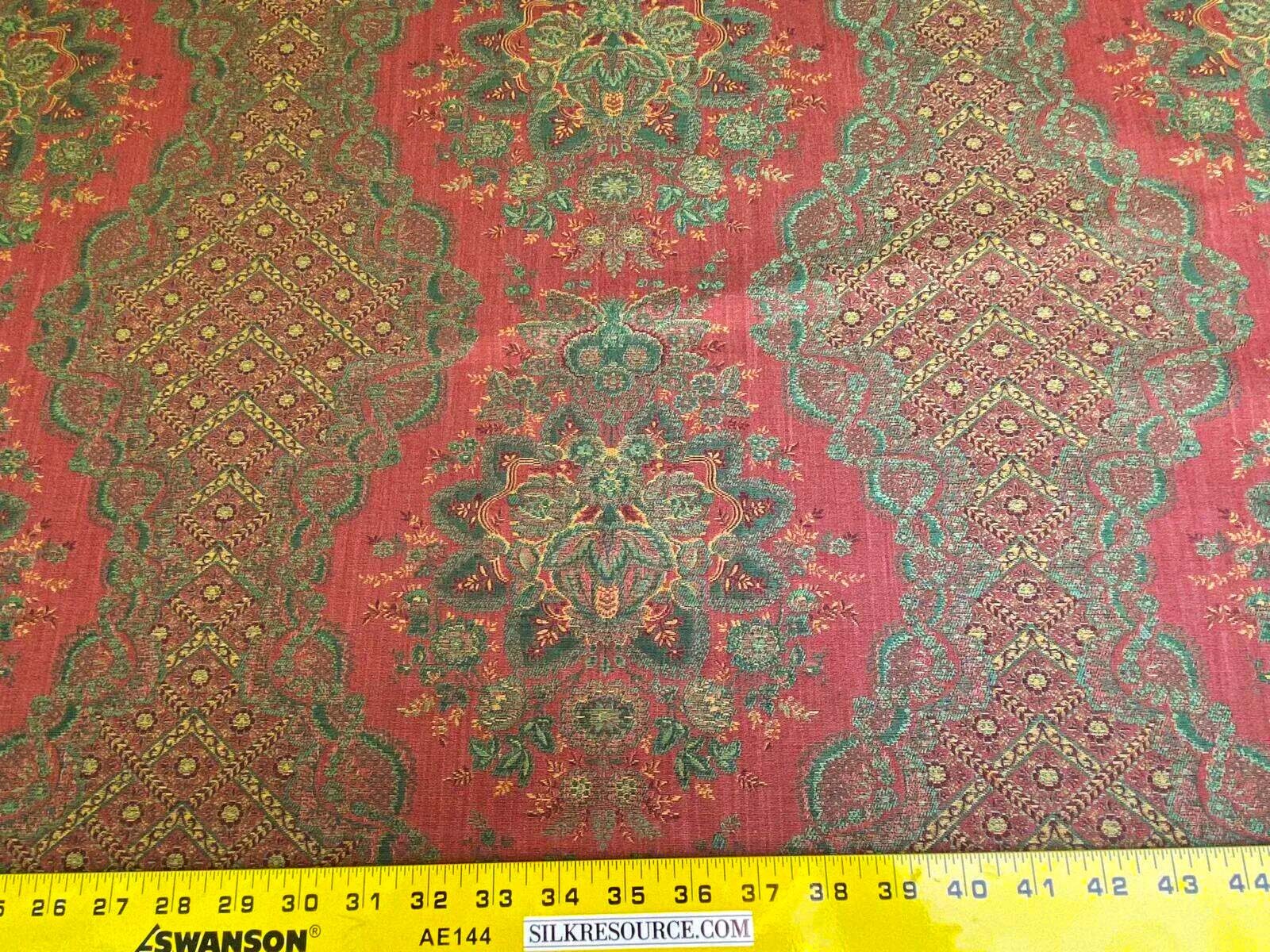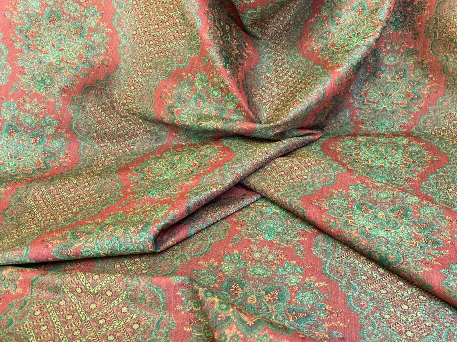 Traditional brocade here takes a more delicate form. Very detailed medallions of flowers and lace, laid out in stripes. iridescent with a silky sheen. It appears quite different under different light. Sometimes the red/pink is more dominant, sometimes the green's shimmer is more eye catching.