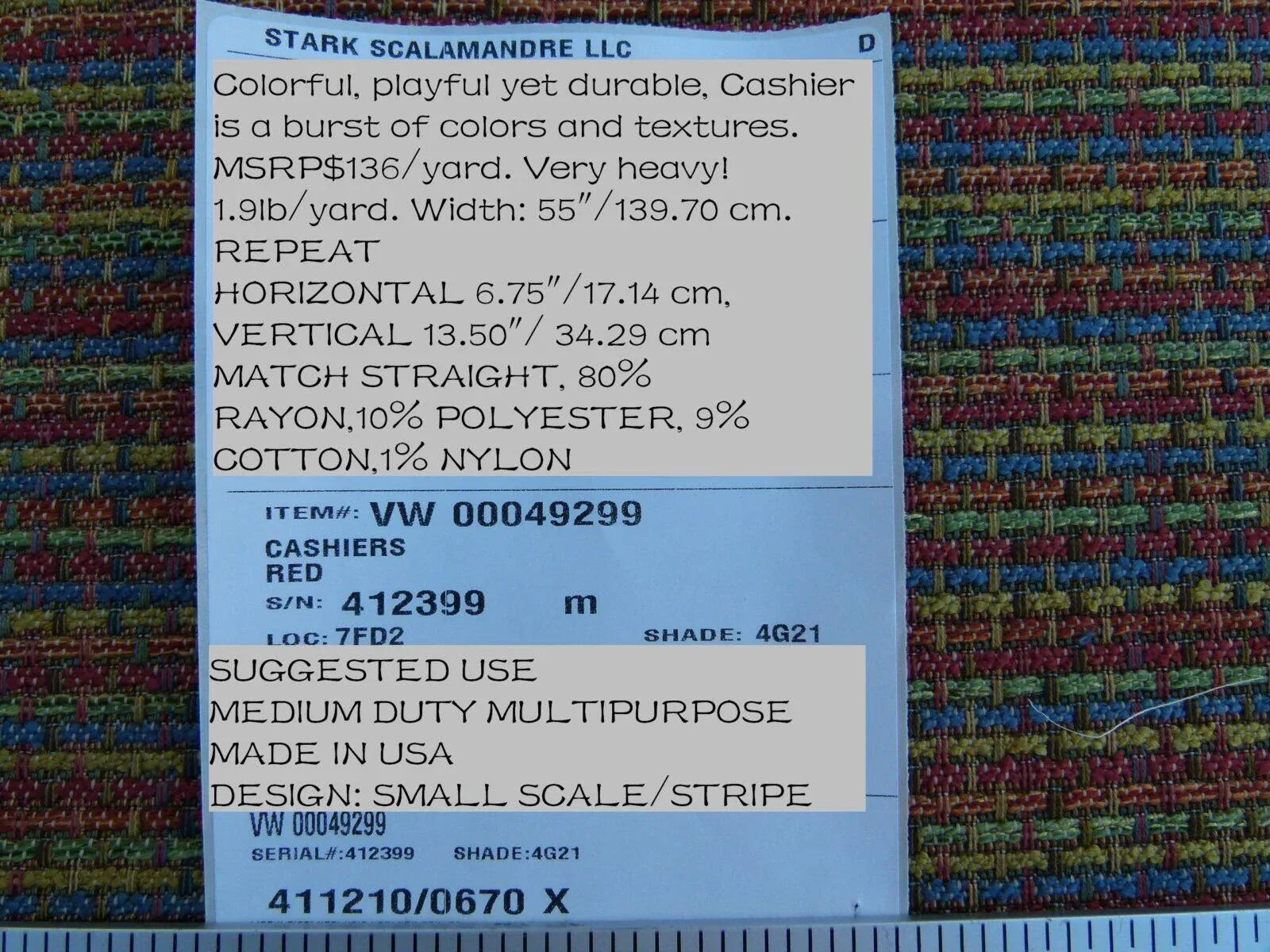 Fiber, repeat, width, weight, country of origin, retail price/yard: Please see text in photos.