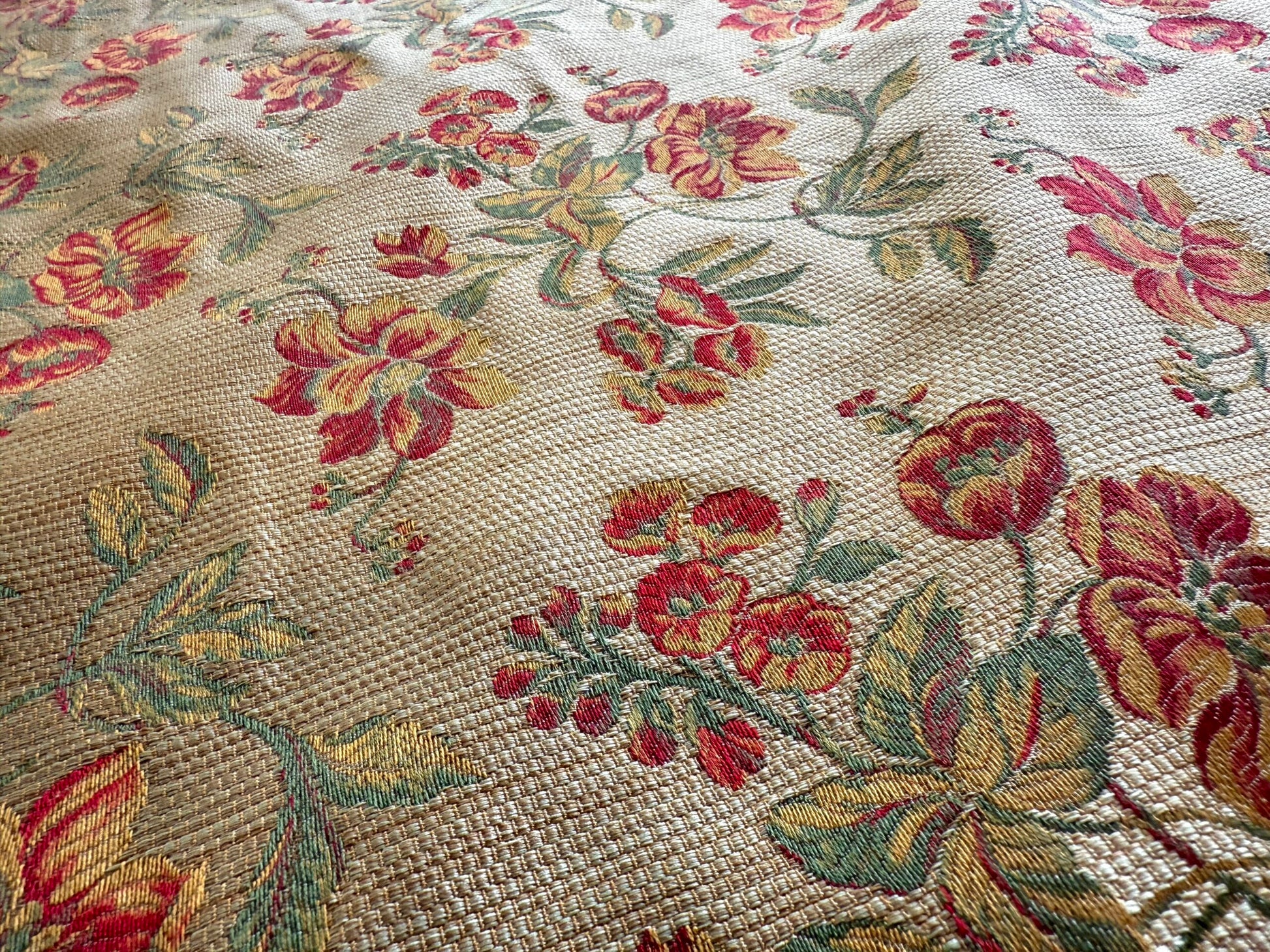 | Glamorous and lush! Woven in France, Charroux depicts a Peony Field. Bright red, green over a textured gold field. The palette is daringly posh and gilded yet the flowers are in a smaller scale which gives it an endearing personality and versatility.