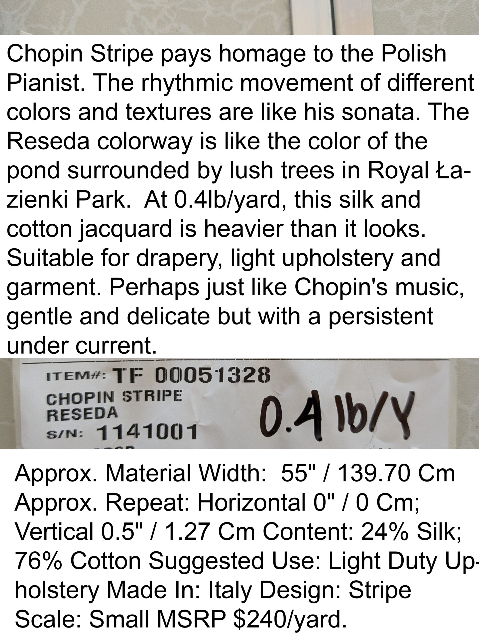 Chopin Stripe pays homage to the Polish Pianist. The rhythmic movement of different colors and textures are like his sonata. The Reseda colorway is like the color of the pond surrounded by lush trees in Royal Łazienki Park.