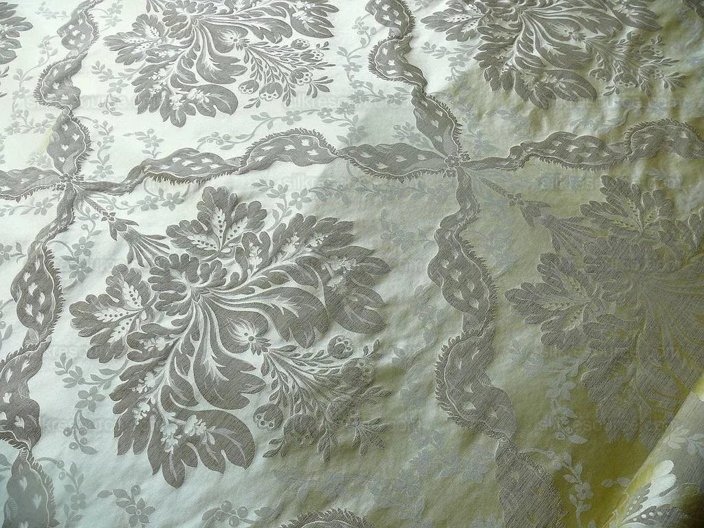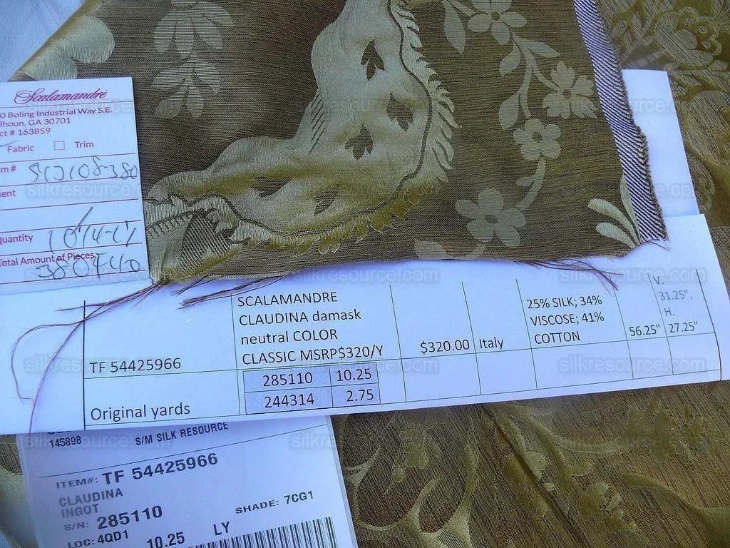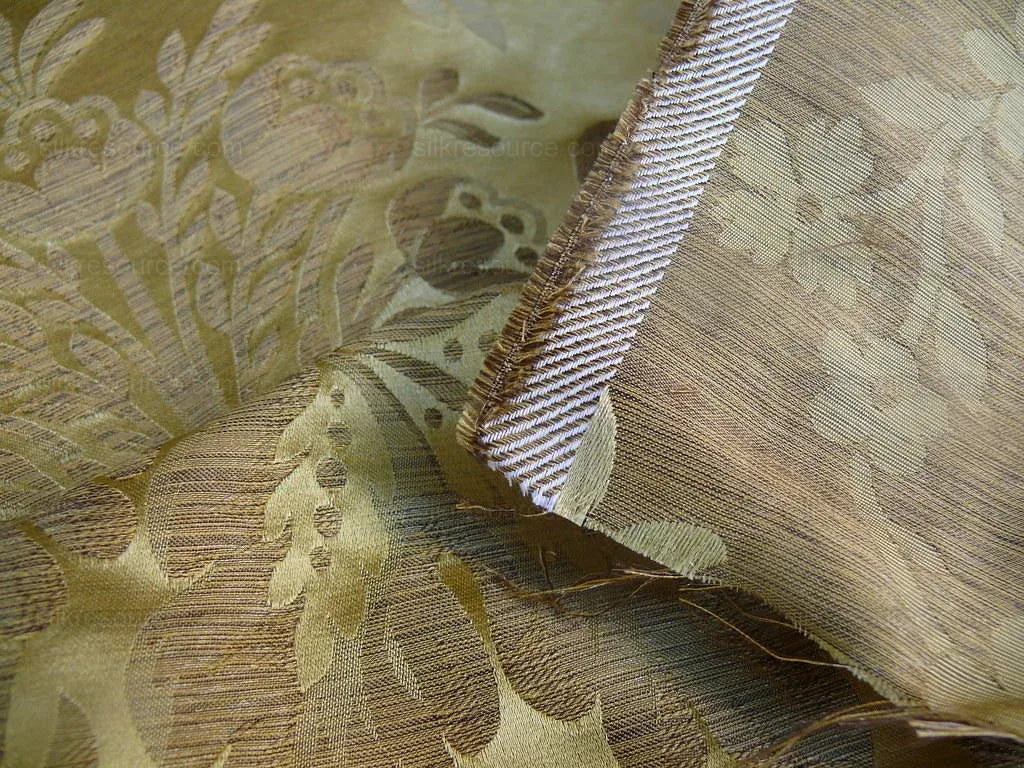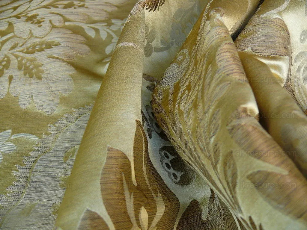 Color: Background is muted ingort/gold with a metallic sheen (very sophisticated and true to historical document.) Print is in gold, Not a bright yellow gold but a muted bronze-gold. Iridescent: bronze, gold, beige and even a hint of olive green---the colors are simply perfect. Very sophisticated & top quality Drapery, upholstery, bedding, over-the-top wallcovering! Color, repeat, fiber content, applications & retail price: please see the printout in photo. Weight: heavy weight silk damask. About 1lb/yard. Soft yet durable. Price is per yard. Total available: see beginning of listing. (Please request a sample)