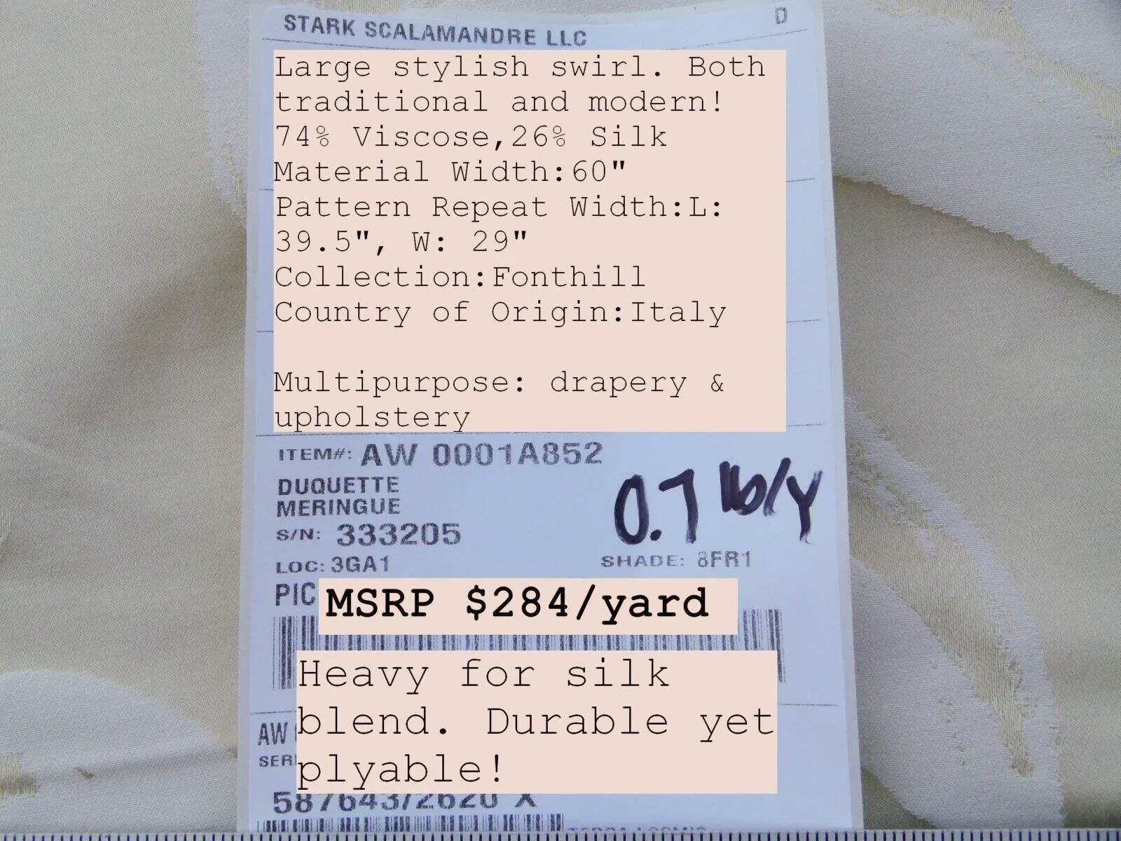 Fiber, repeat, width, weight, country of origin, retail price/yard: