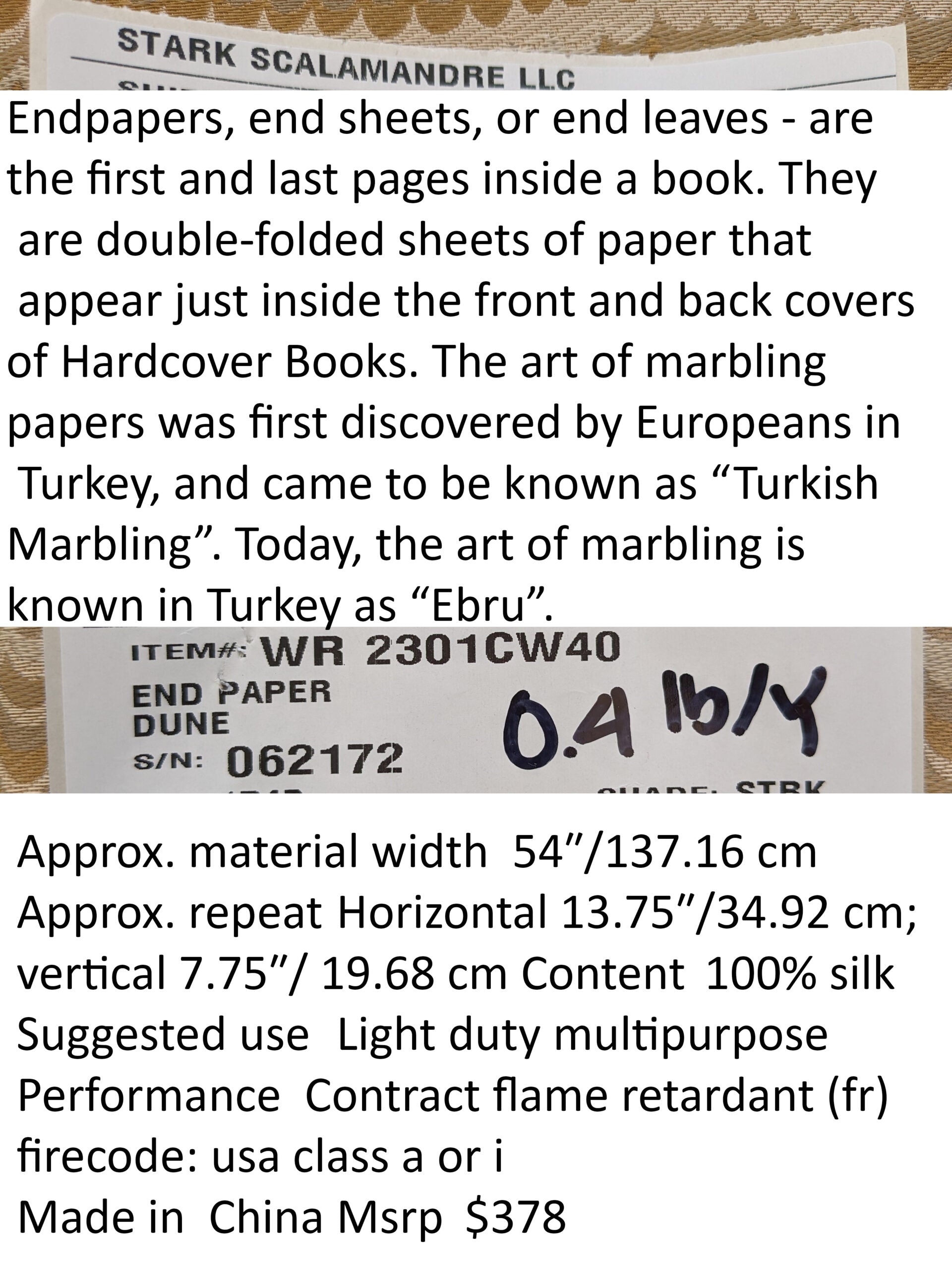 Endpapers, also called end sheets or end leaves – are the first and last pages inside a book. They are double-folded sheets of paper that appear just inside the front and back covers of Hardcover Books. The art of marbling papers was first discovered by Europeans in Turkey, and came to be known as “Turkish Marbling”. Today, the art of marbling is known in Turkey as “Ebru”. Scalamandré’s glamorous interpretation of a classic feather-like marble pattern known as “Nonpareil” is woven in a lustrous blend of silk and viscose, for a nearly iridescent surface with an incredible drape. The colorations are rich and exotic, almost jewel-like in their blend of shimmering, saturated hues.