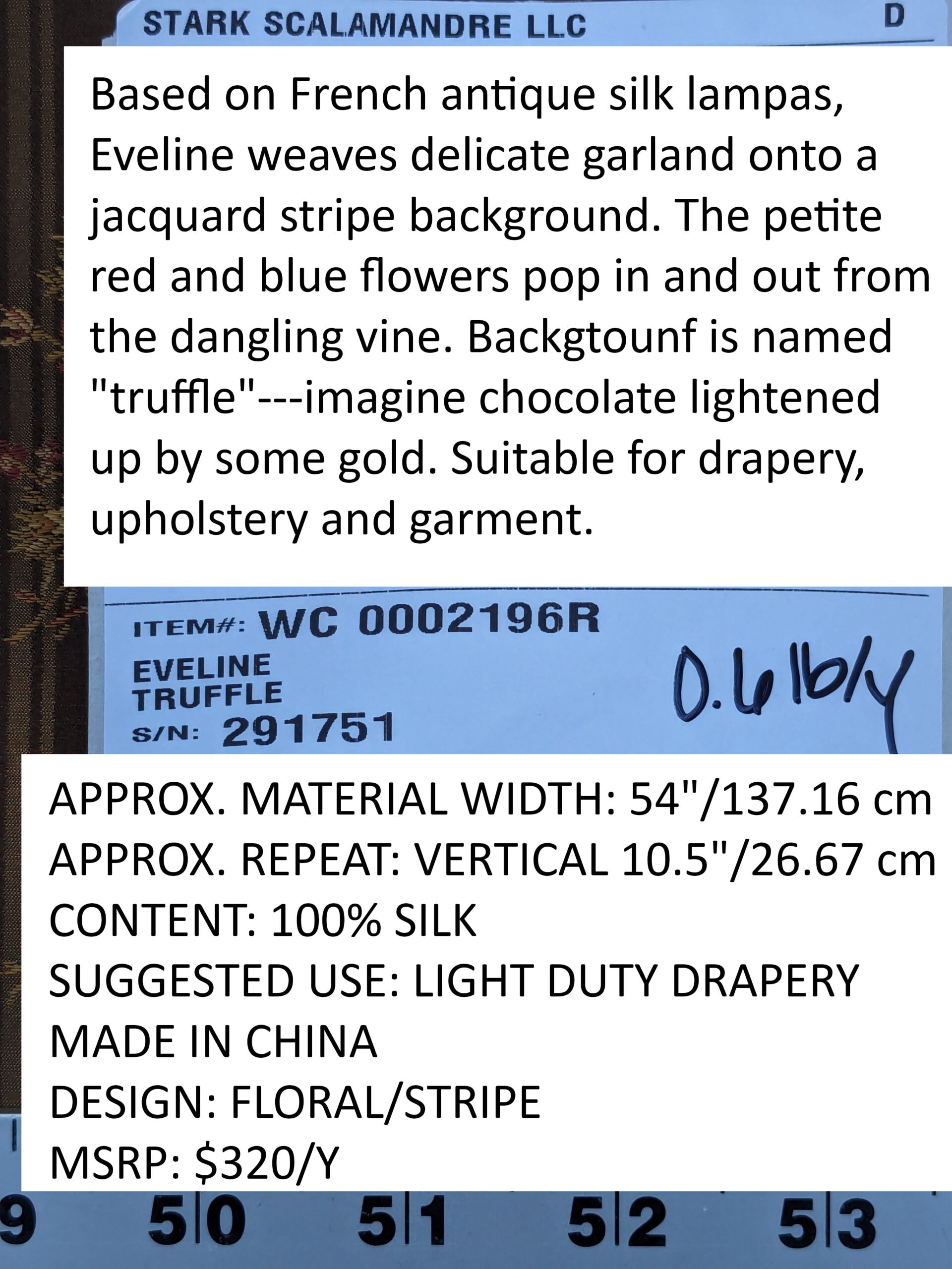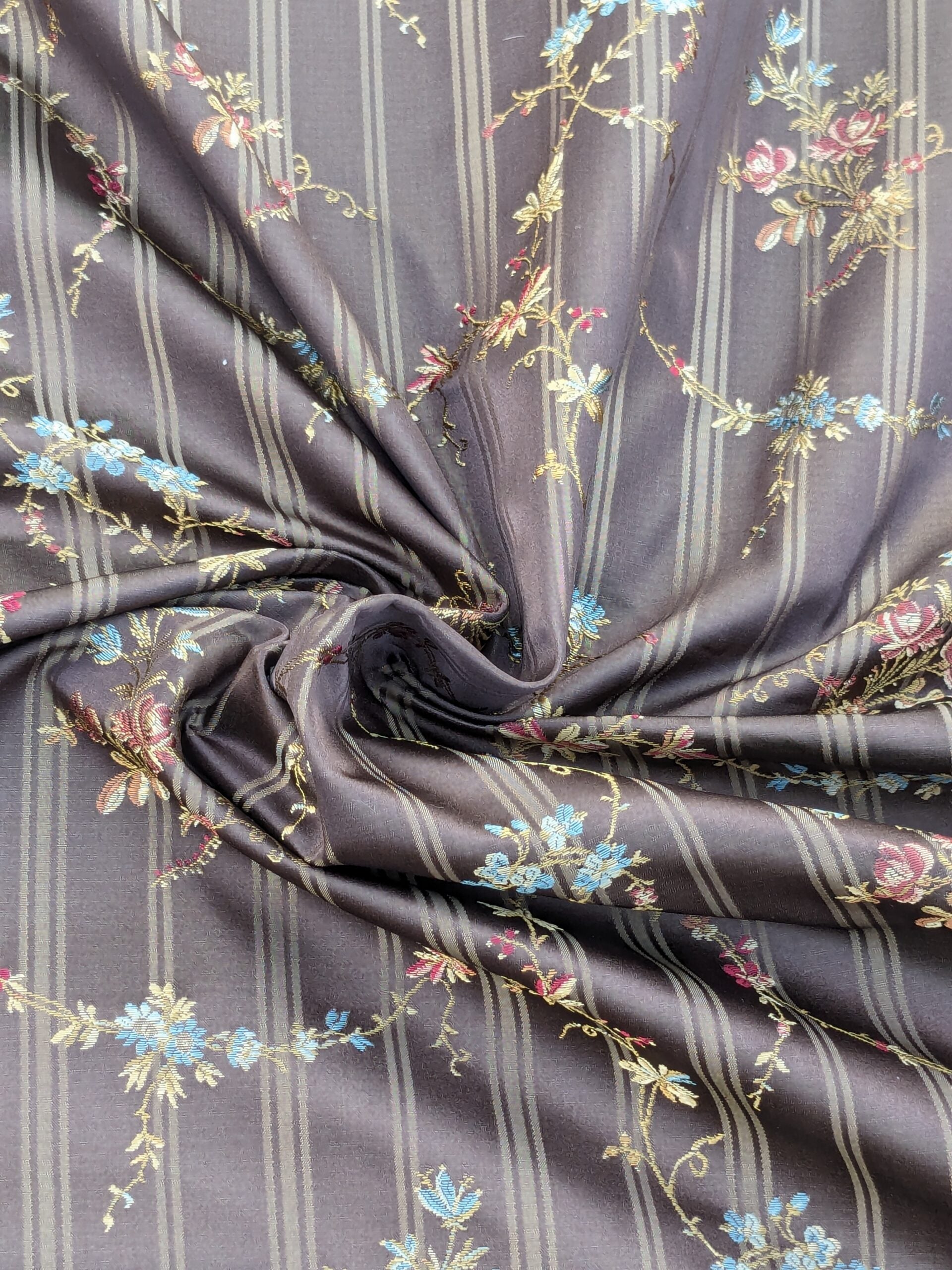 Based on French antique silk lampas, Eveline weaves delicate garland onto a jacquard stripe background. The petite red and blue flowers pop in and out from the dangling vine. Backgtound color is named "truffle"---imagine chocolate lightened up by some gold. Suitable for drapery, upholstery and garment.