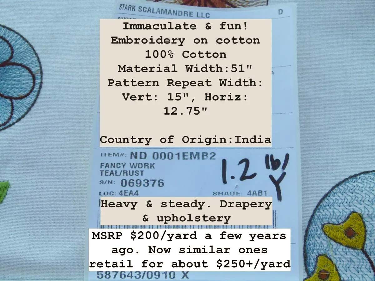 Fiber, repeat, width, weight, country of origin, retail price/yard: Please see text in photos.