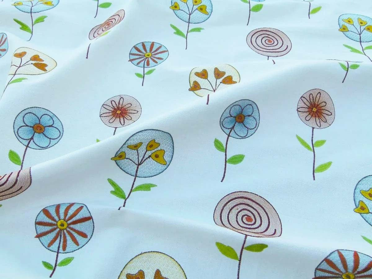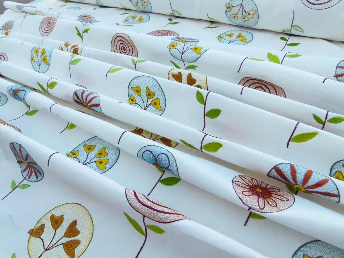 Scalamandre Fancy Work Teal Rust Red On White Modern Flower Power Embroidery MSRP USD 200/yard Old World Weavers