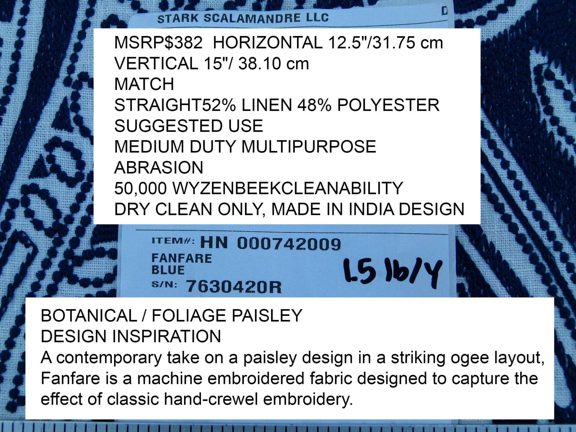 Scalamandre Fanfare Blue Paisley Design Embroidery MSRP USD 382