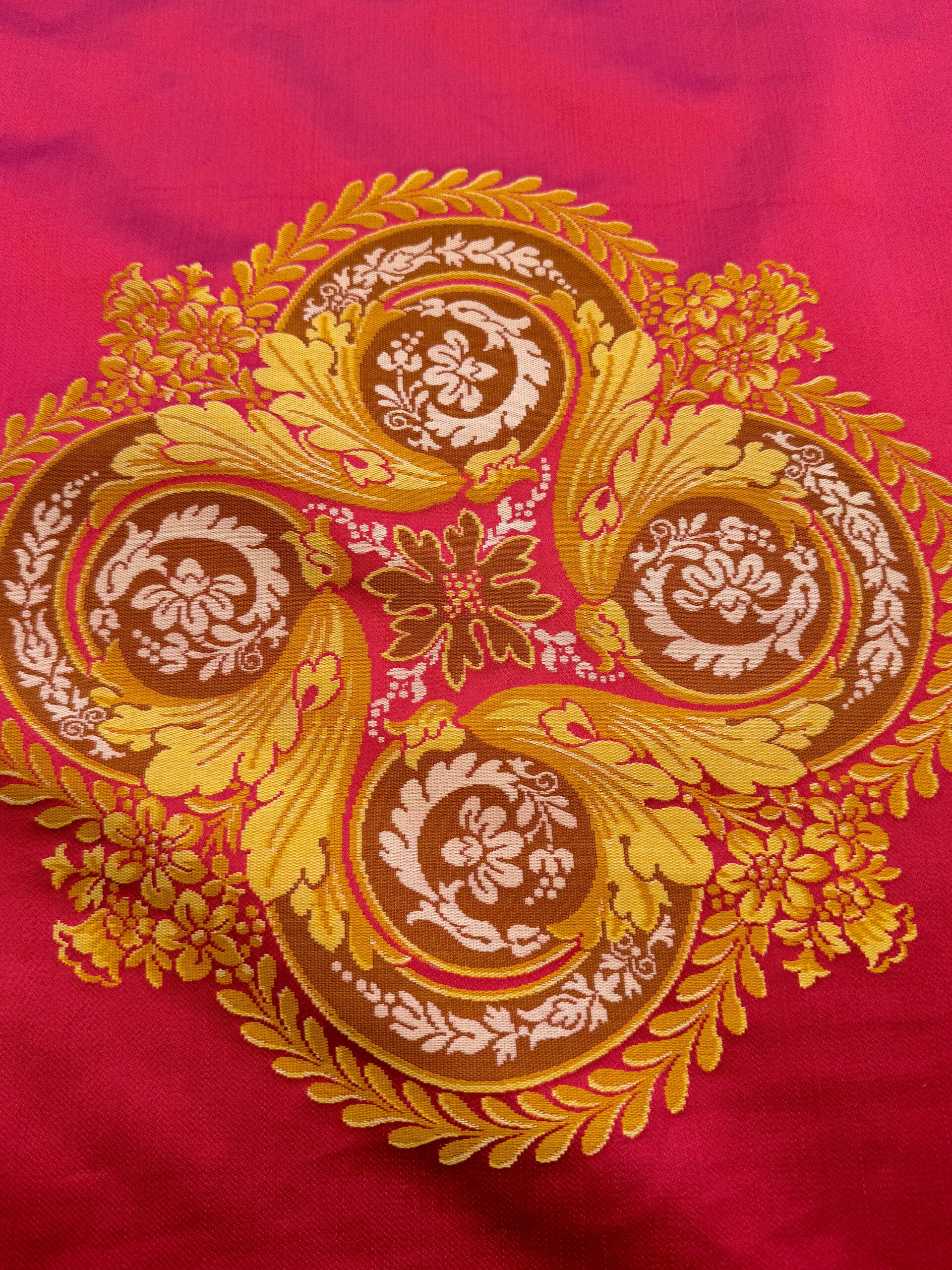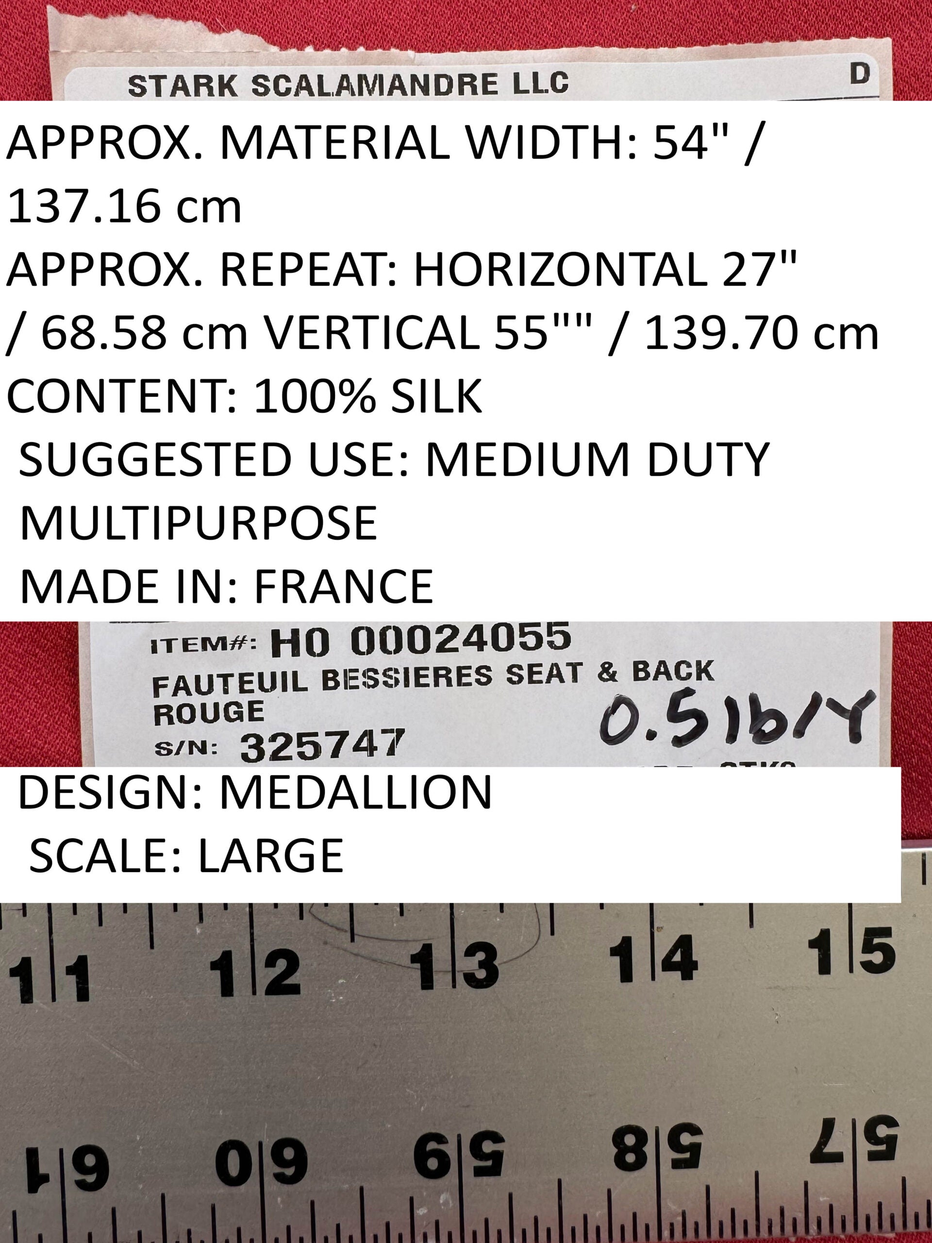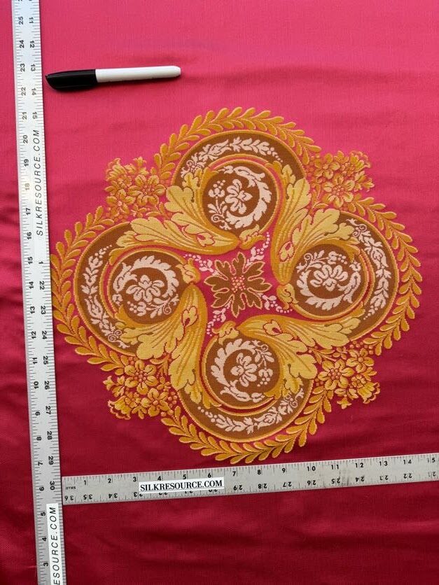 APPROX. MATERIAL WIDTH: 54"" / 137.16 cm APPROX. REPEAT: HORIZONTAL 27"" / 68.58 cm; VERTICAL 55"" / 139.70 cm CONTENT: 100% SILK SUGGESTED USE: MEDIUM DUTY MULTIPURPOSE MADE IN: FRANCE DESIGN: MEDALLION SCALE: LARGE |