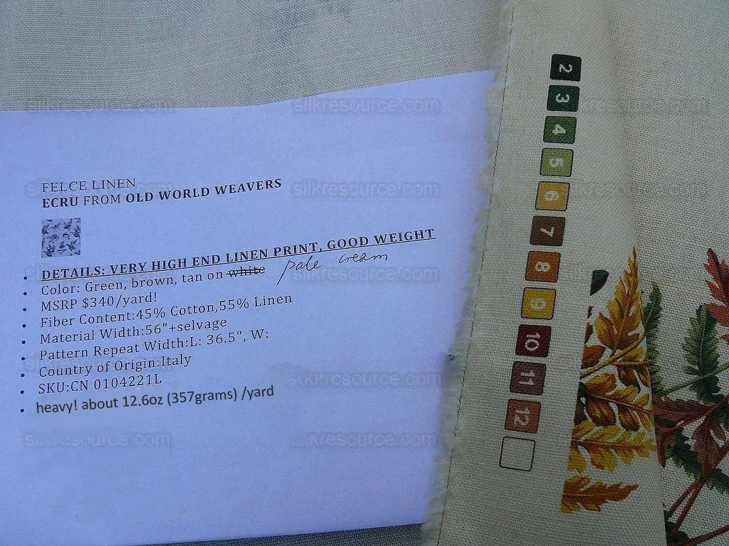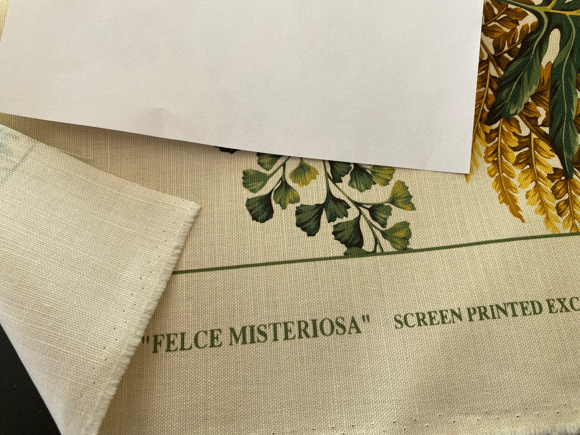 Among all the FERN PRINTS we've seen, this is the most beautiful: sharp, elaborate, charming and full of stories. Color: Background is pale cream/ tan (see white paper in photos for contrast) Designer: Scalamandre / Old World Weavers. Authentic Scalamandre/Old World Weavers. Has labels from Scalamandre. MSRP: SEE PRINTOUT IN PHOTO (official number from Scalamandre). Color: Background is pale cream/ tan VR36.5, HR56” (the whole width). Width 56"plus selvedge. Weight: Heavy weight and durable. about 12.6oz (357grams) /yard. Our price is way below wholesale! Drapery, upholstery, bedding, over-the-top wallcovering! Total available: see beginning of listing.