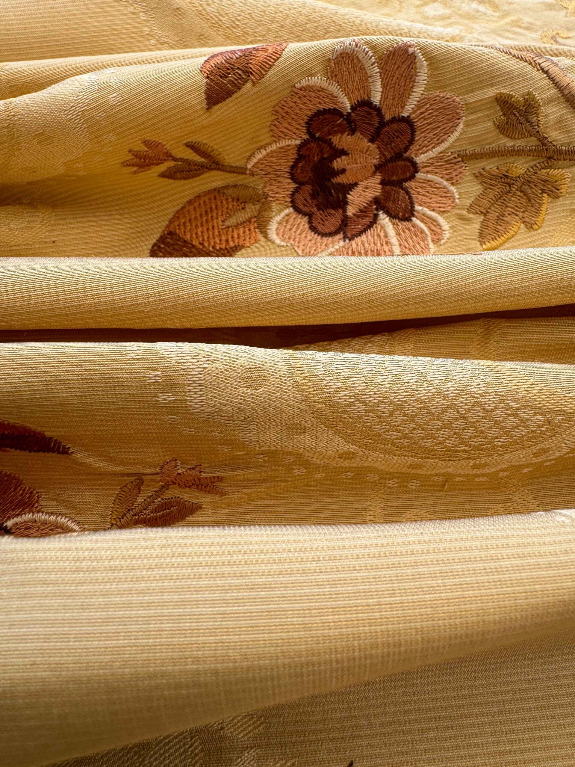 Weight: medium heavy weight silk damask. About 0.5lb/yard. Soft, yet durable enough for upholstery purpose
