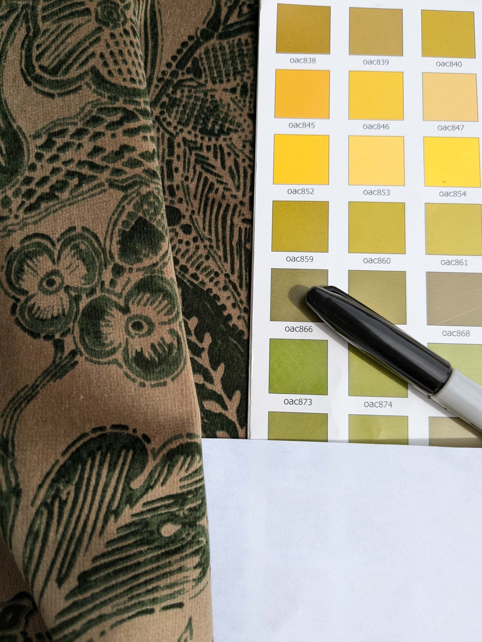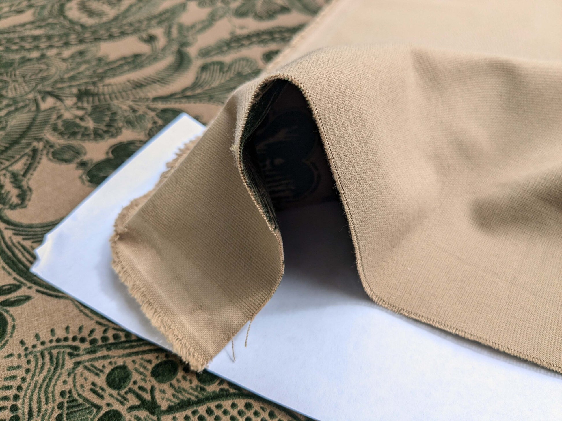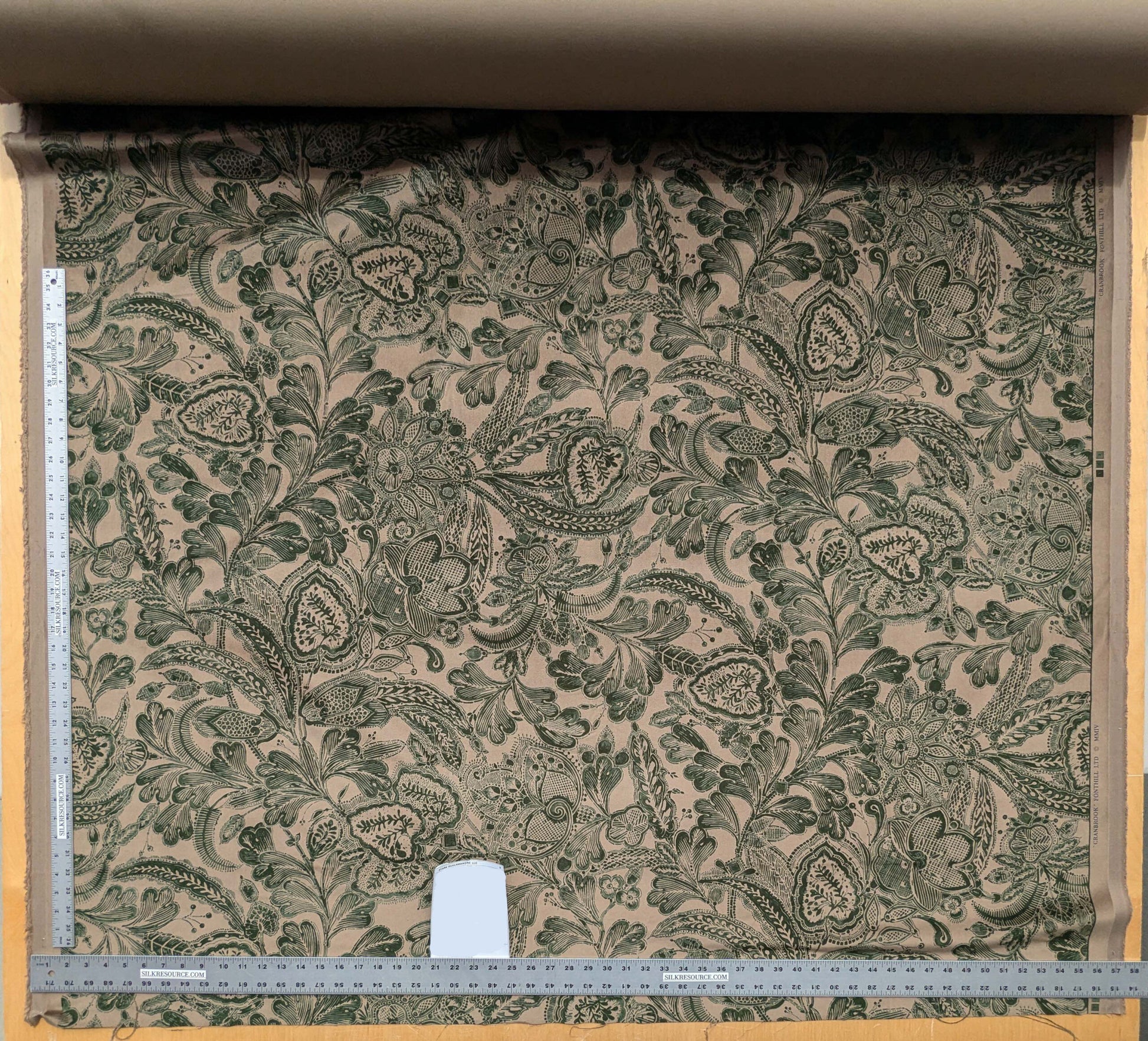 Color: print is in deep forest emerald green. Background is a warm beige-mocha-brown.