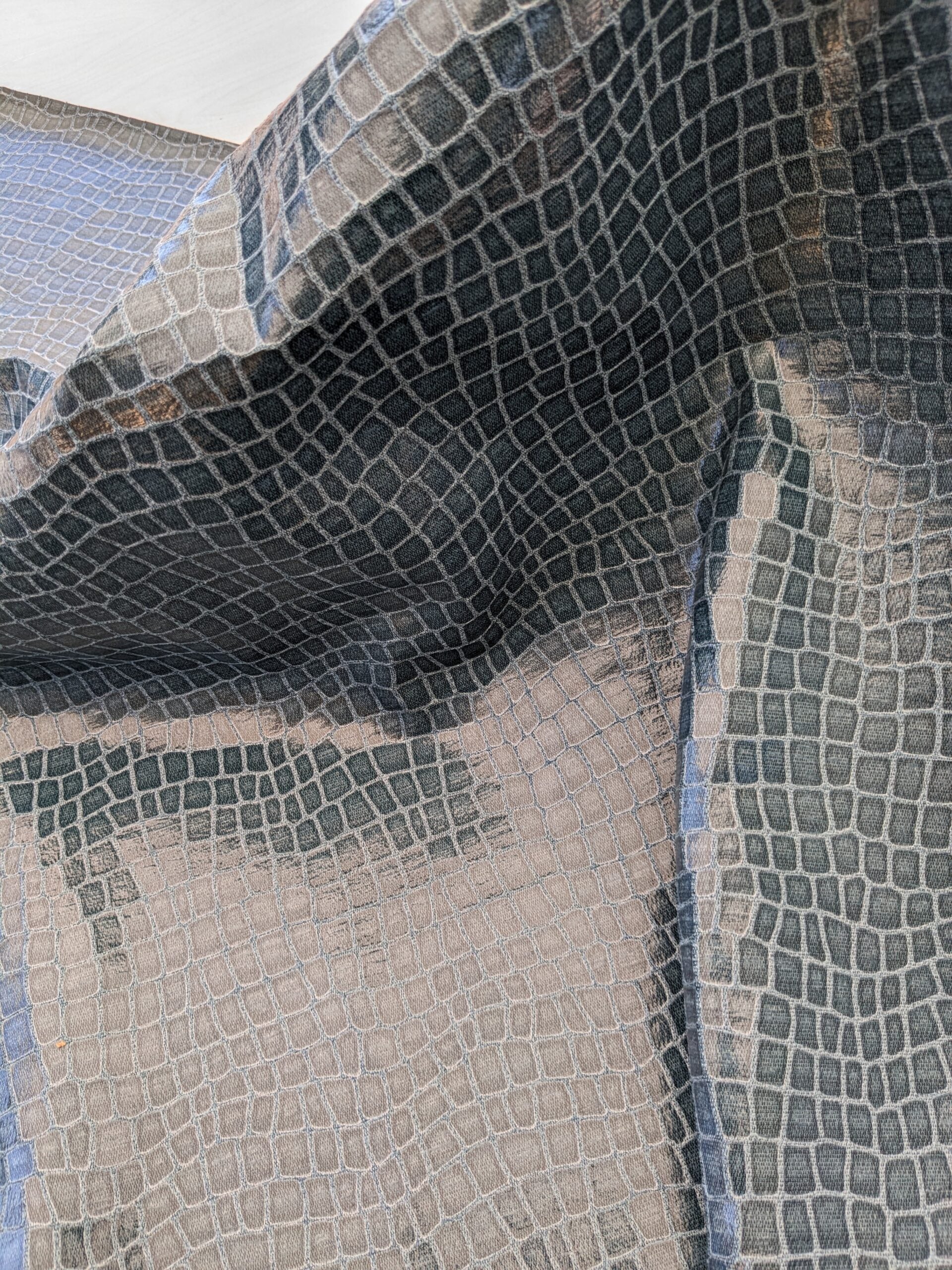 | Gator is such a fun trip to New Orleans! Gator is a slightly shiny foiled textile in alligator skin design. A new neutral. Heavy and textured, it commands attention in a quiet way.