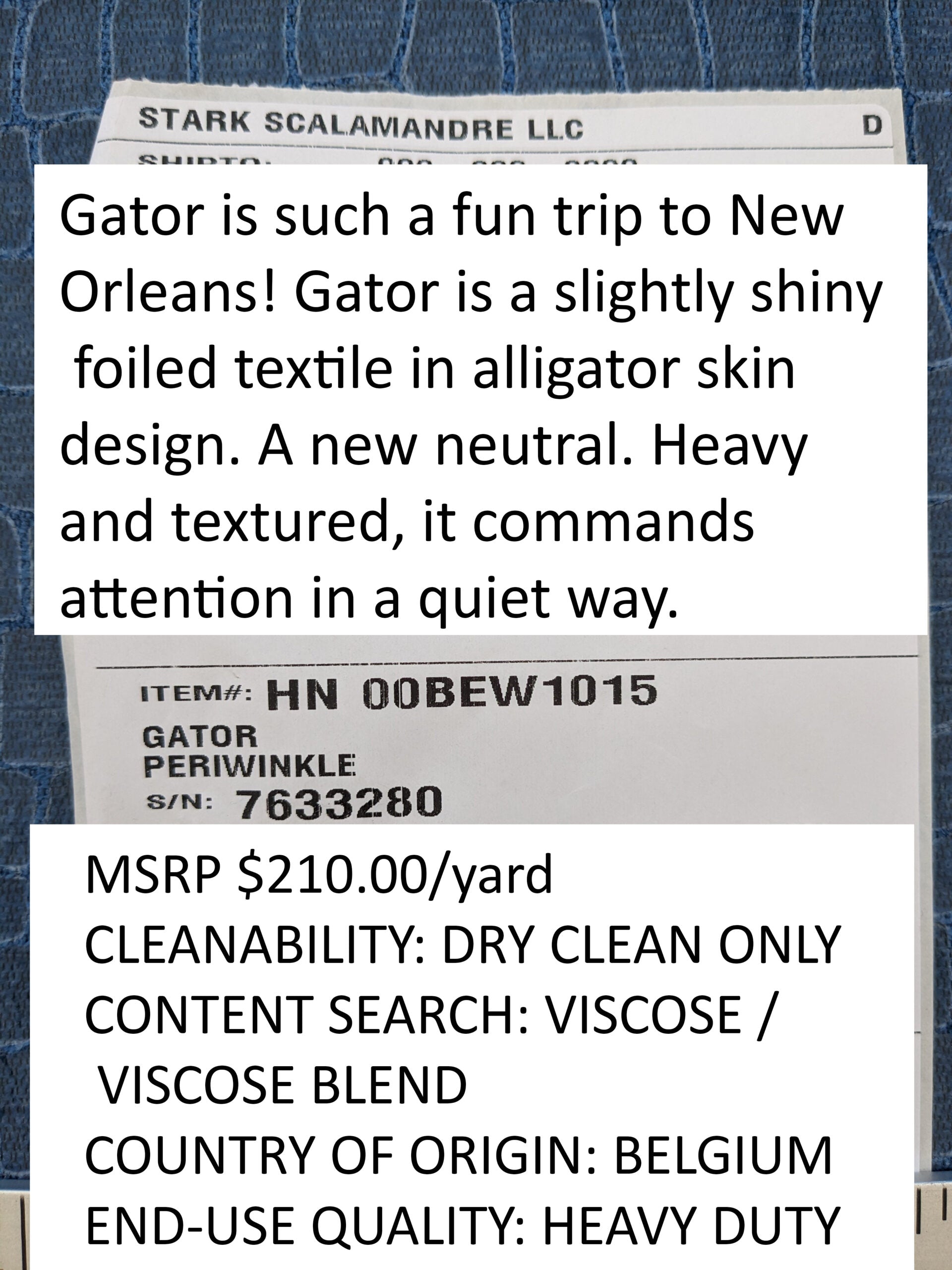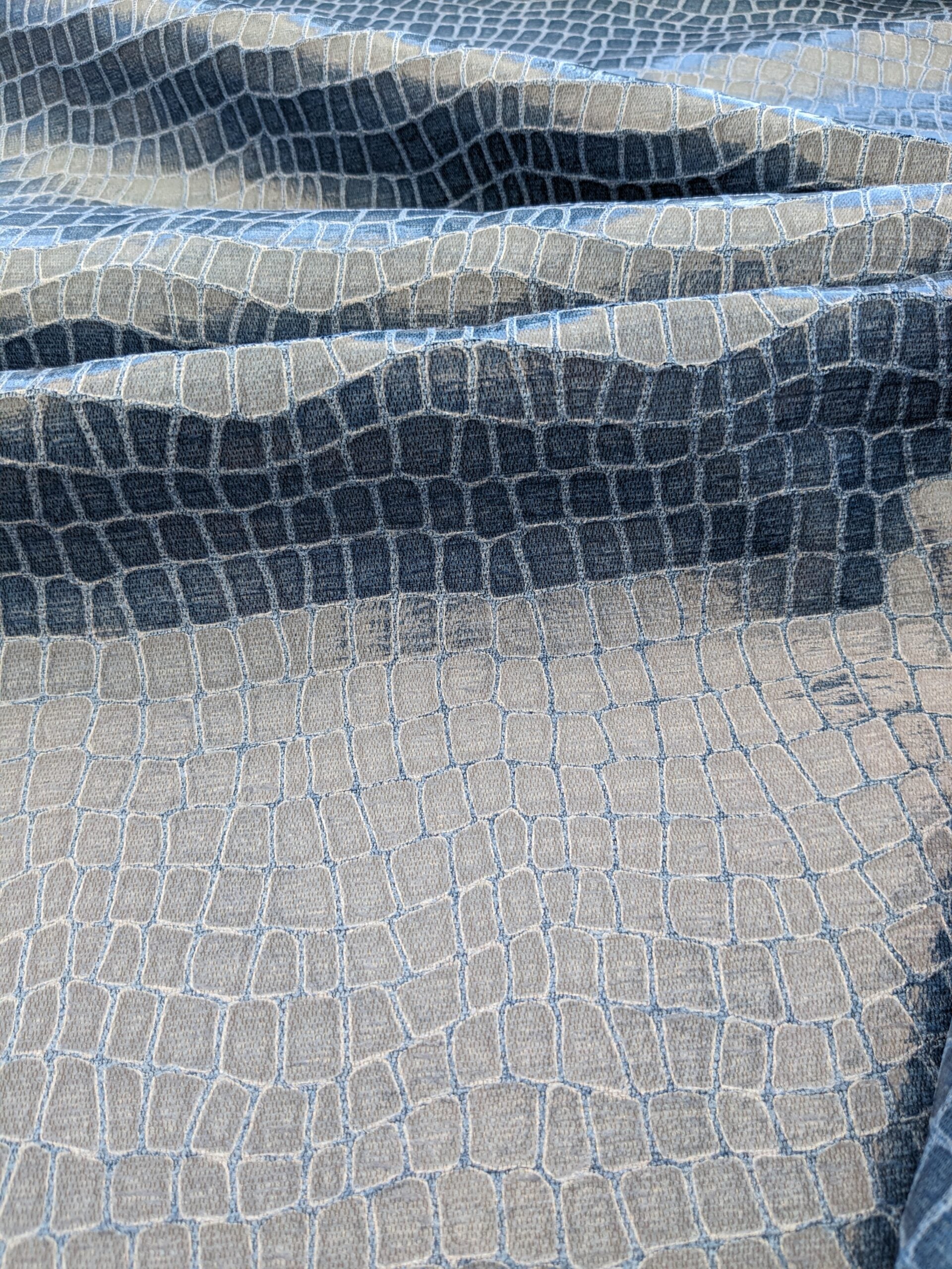 | Gator is such a fun trip to New Orleans! Gator is a slightly shiny foiled textile in alligator skin design. A new neutral. Heavy and textured, it commands attention in a quiet way.