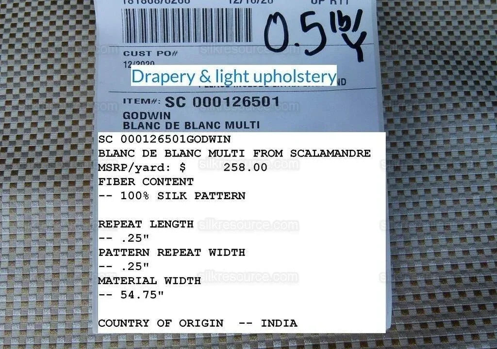 Fiber, repeat, width, weight, country of origin, retail price/yard: