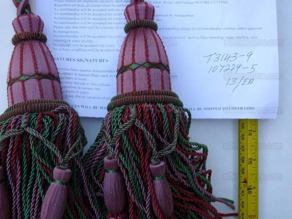 Most luxurious hand-made tie-back in silk! Designer: Scalamandre Name: LYON, sku: T3143-009, Double Tassel Tieback 80% Silk, 15% Wood, 5% Wire Color: RED, GREEN, PURPLE Approx Length: 8",Cord Spread: 30 " , MSRP $1,060 Listing is for one tieback. Available: 21 |