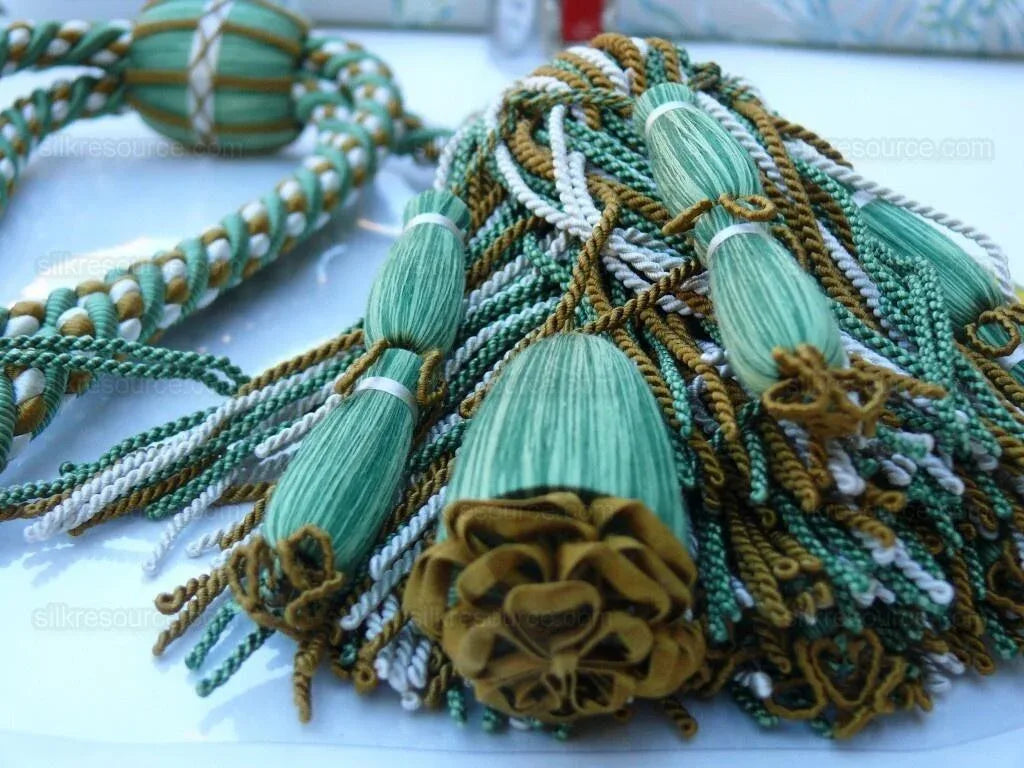 The amount of work in this hand made tieback is staggering: silk yarns are custom dyed into many colors and perfectly picked for coordination. Then skillful artisans wrap, tie, braid, twist, pull, and knot these silk yarns onto wood and wire. The end result? An endlessly intriguing piece of art! Heavy and luminous, this tieback is quietly impactful for a whole room. You can use it on drapery, chairs, vases, table decoration, Christmas tree or simply hang it on the wall to admire! Most luxurious hand-made tie-back in 80% silk, 15% wood & 5% wire . The harmonious colors of metallic bronze, deep hunter green, cream is easy on the eyes and very sophisticated. It fits both a green theme or other colors. Designer: Scalamandre Name: HAMPTON COURT, sku: T3143-001, Double Tassel Tieback 80% Silk, 15% Wood, 5% Wire Color: Brown, Green, Cream (metallic bronze, deep hunter green, cream) Approx Length: 10",Cord Spread: 30 " , MSRP $1,058.00" Listing is for one tieback. Available: 6 |