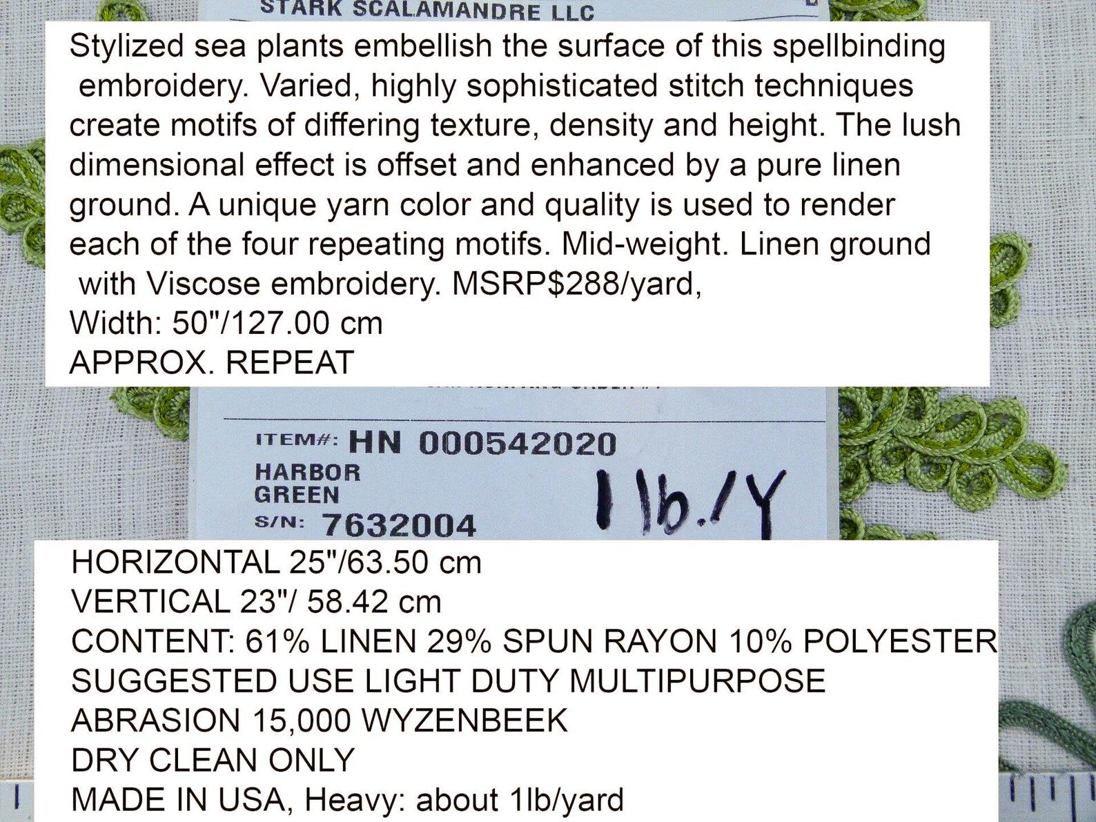 Scalamandre Harbor Green Seaweeds Ocean Plants Coral Reef Embroidery Linen MSRP USD 288